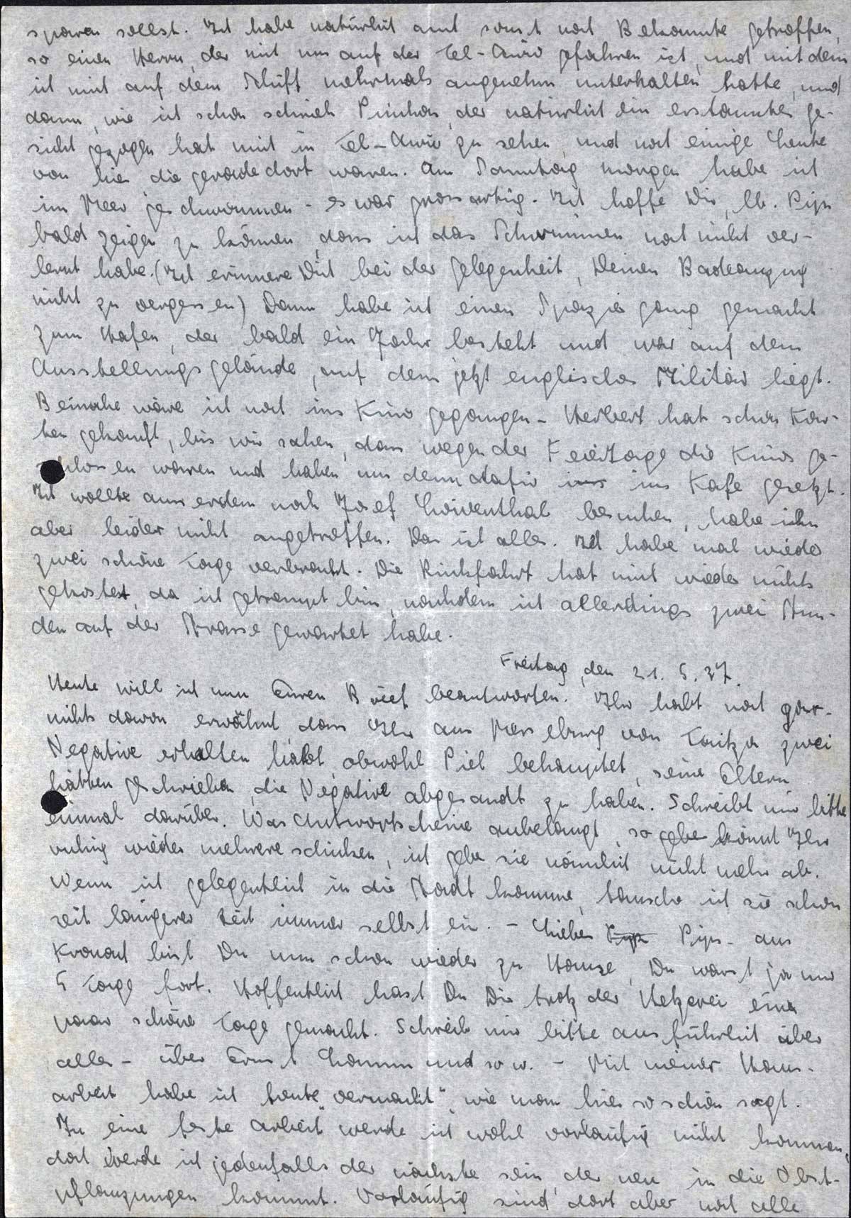 sparen sollst. Ich habe natürlich auch sonst noch Bekannte getroffen, so einen Herrn, der mit uns auf der Tel-Aviv gefahren ist, und mit dem ich mich auf dem Schiff mehrmals angenehm unterhalten hatte, und dann, wie ich schon schrieb Pinchas, der natürlich ein erstauntes Gesicht gezogen hat mich in Tel-Aviv zu sehen, und noch einige Leute von hier, die gerade dort waren. Am Sonntag morgen habe ich im Meer geschwommen - es war grossartig. Ich hoffe Dir, lb. Pips, bald zeigen zu können, dass ich das Schwimmen noch nicht verlernt habe. (Ich erinnere Dich bei der Gelegenheit, Deinen Badeanzug nicht zu vergessen). Dann habe ich einen Spaziergang gemacht zum Hafen, der bald ein Jahr besteht und war auf dem Ausstellungsgelände, auf dem jetzt englisches Militär liegt. Beinahe wäre ich noch ins Kino gegangen - Herbert hat schon Karten gekauft, bis wir sahen, dass wegen der Feiertage die Kinos geschlossen waren und haben uns denn dafür ins Kafe gesetzt. Ich wollte ausserdem noch Josef Löwenthal besuchen, habe ihn aber leider nicht angetroffen. Das ist alles. Ich habe mal wieder zwei schöne Tage verbracht. Die Rückfahrt hat mich wieder nichts gekostet, da ich getrempt bin, nachdem ich allerdings zwei Stunden auf der Strasse gewartet habe.