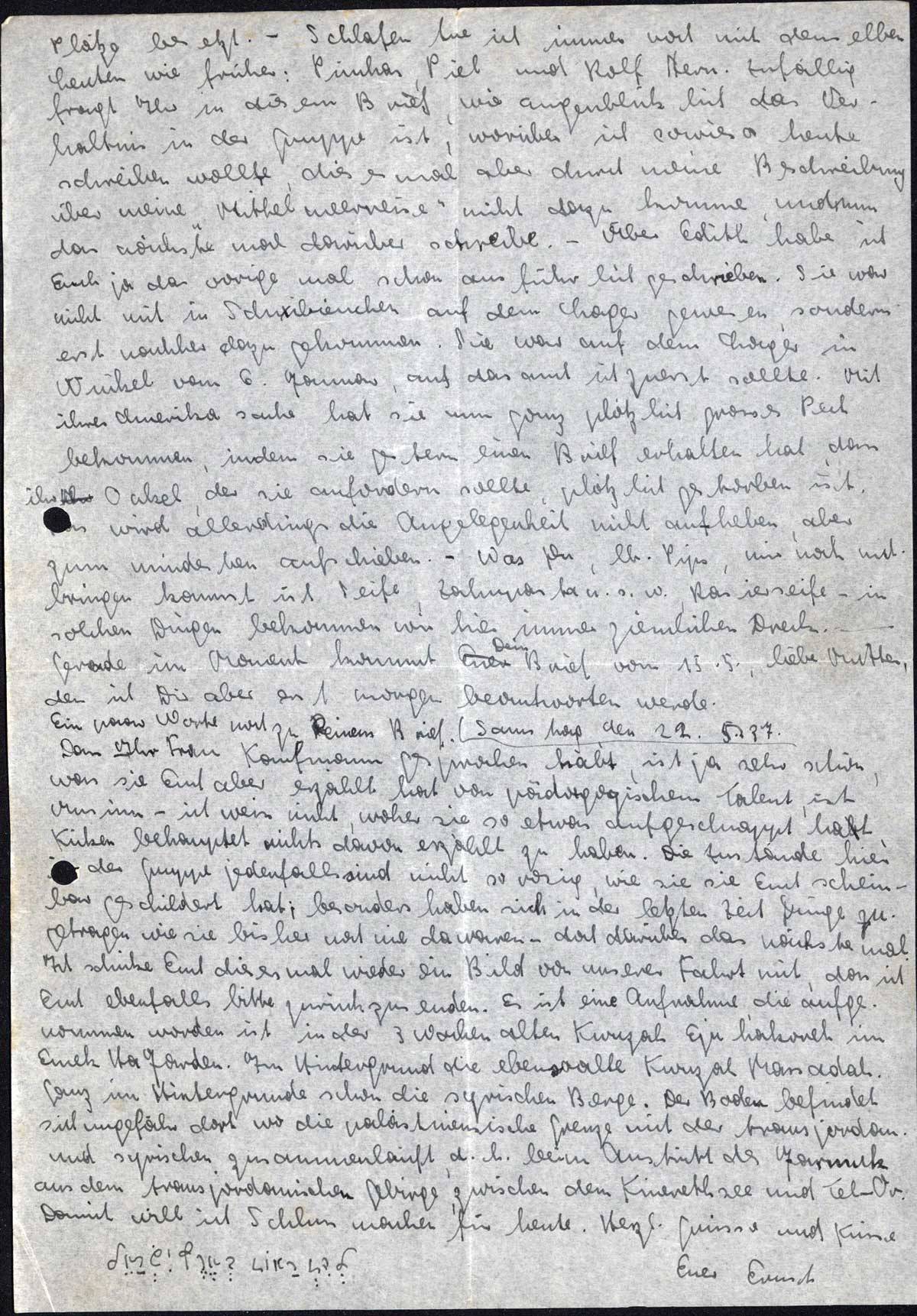 Recht vielen Dank für Euren lb. Brief vom 4.5., den ich gestern erhielt, und für 10 M, die ich gleichfalls erhielt. Bevor ich auf den Brief eingehe, will ich Euch erst über meine Fahrt nach Tel-Aviv bezw. Rananah schreiben. Um 3 Uhr Freitag mittags hören wir zufällig, Piel (mein Chawer) und ich, dass wir die Möglichkeit haben um 4 Uhr mit einem Lastwagen nach Tel-Aviv zu fahren, da haben wir uns schnell umgezogen, haben zu Schiker gesagt „wir fahren nach Tel-Aviv, schalom liha”, und sind losgefahren. Pinchas war nicht da, wir haben ihn später in Tel-Aviv getroffen. Das Fahren ist jetzt in ruhigen Zeiten überhaupt nicht mehr mit so grossen Anstrengungen verbunden, ich meine, was die Redegewandheit betrifft, um die Leute von der „Wichtigkeit” einer solchen Fahrt zu überzeugen, wie das früher immer notwendig war. Wir sind also losgefahren und wollten eigentlich abends noch nach Rananah, sind aber erst um 7 Uhr in Tel-Aviv angekommen, da das Auto unterdes noch Steine auf- und abgeladen hat und mussten also in Tel-Aviv bei Herbert übernachten, der sich mit meinem Kommen sehr gefreut hat. Am Schabbath morgen sind wir zusammen nach Rananah getrempt - noch ungefähr 20 km von Tel-Aviv, Piel ist in die Kwuzah des Mak. Haz. gegangen, wo er eine Schwester hat, und ich zu Speyers, von denen ich Euch nochmals herzlich grüssen soll und die sich freuen werden, Dich lb. Pips, bald einmal dort zu sehen. Ich habe dort mal wieder gut bürgerlich zu mittag gegessen (Nudelsalat), bin noch einen Stunde in die Kwuzah gegangen und dann - ich bin ein vornehmer Herr - mit einer Taxe nach Tel-Aviv gefahren, welcher Spass mit 6 Piaster gekostet hat, während der Omnibus, der aber an Feiertagen nicht fährt, 5 Piaster verlangt. Piel ist über Nacht in Rananah geblieben und hat mich am Sonntag mittag in Tel-Aviv abgeholt. Ich habe also in Tel-Aviv noch einen sehr schönen Tag verlebt. Ich habe übrigens Herrn Mendel getroffen, der mich zu einer Portion Eis eingeladen hat, und mich das 1000ste mal gefragt, was ich von zu Hause höre. Ich habe ihn noch einmal wegen der Touristenklasse gefragt (Frau Mendel hatte ich nicht mehr gesprochen) und auch er sagte mir, dass Du die 90 M natürlich
