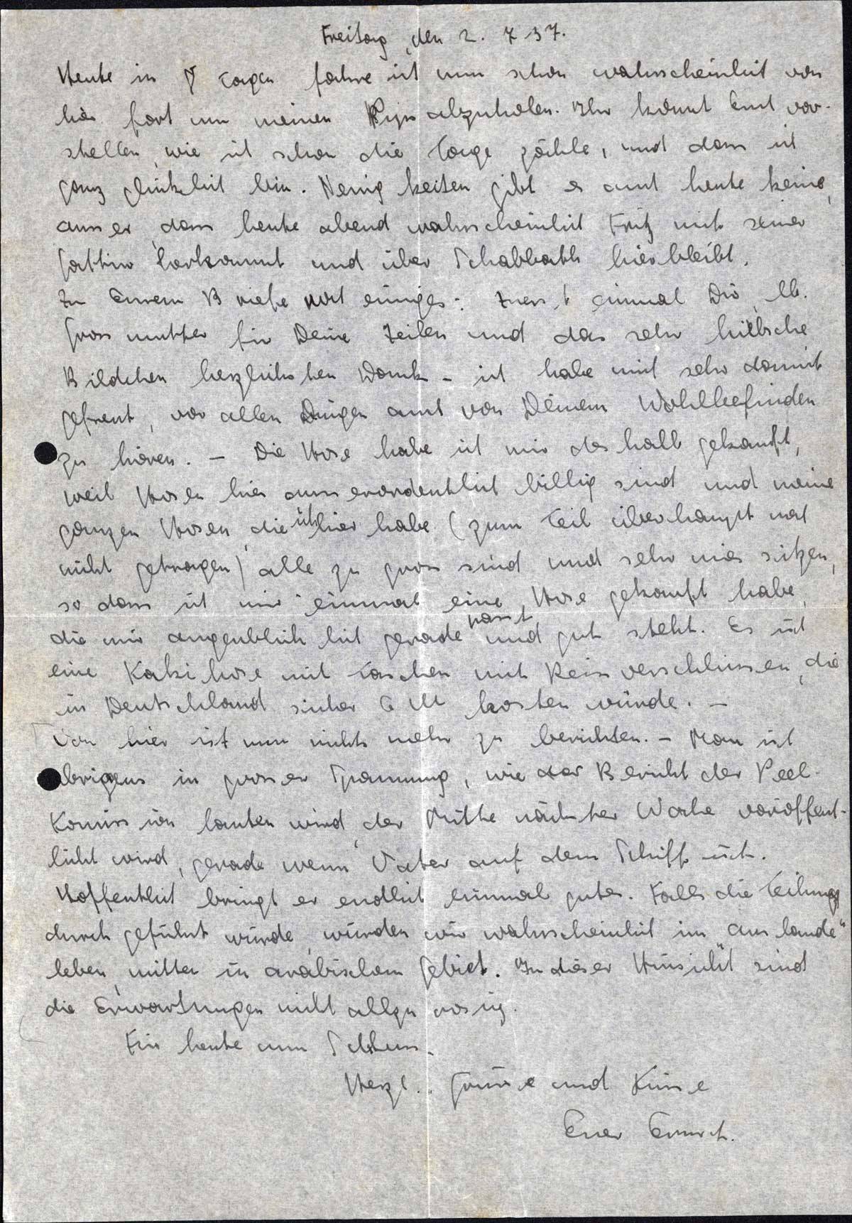 Von hier ist nun nichts mehr zu berichten. - Man ist übrigens in großer Spannung, wie der Bericht der Peel-Kommission lauten wird, der Mitte nächster Woche veröffentlicht wird, gerade wenn Vater auf dem Schiff ist. Hoffentlich bringt er endlich einmal Gutes. Falls die Teilung durchgeführt würde, würden wir wahrscheinlich im „Auslande“ leben, mitten in arabischem Gebiet. In dieser Hinsicht sind die Erwartungen nicht allzu rosig.