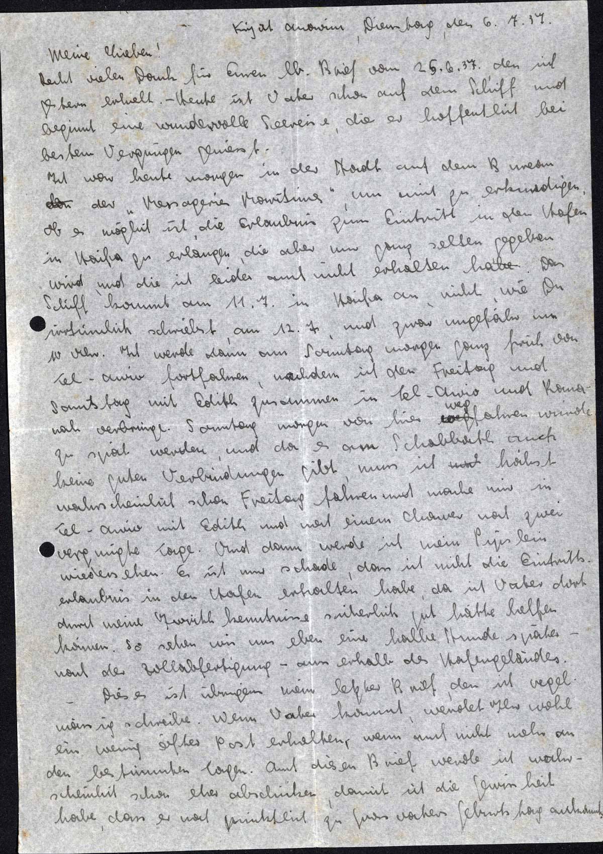 Recht vielen Dank für den Luftpostbrief vom 3.7., den ich heute erhielt - so habe ich nun endlich die Gewissheit, dass alles in Ordnung ist. Du schreibst, liebe Mutter, dass ich den Brief nur an Vater gerichtet hätte - wenn ich auch nur „Lieber Vater” darüber geschrieben habe, so war der Brief doch selbstverständlich an Euch alle gerichtet. - Ich schicke diesen Brief doch nach Krefeld, da er noch zu Grossvaters Geburtstag ankommen soll; Grossvater wird ihn dann natürlich sofort nach München schicken. Meine weitere Post, die Vater und ich nun gemeinsam schreiben, geht natürlich nach München. Dass Du, lb. Mutter, nach München fährst, freut mich überhaupt sehr - so machst auch Du Dir in der Zeit noch ein paar schöne Tage. Nun Schluss für heute. Übermorgen fahre ich hier fort und werdet Ihr bald von uns beiden gemeinsam aus Haifa einen Brief erhalten.
