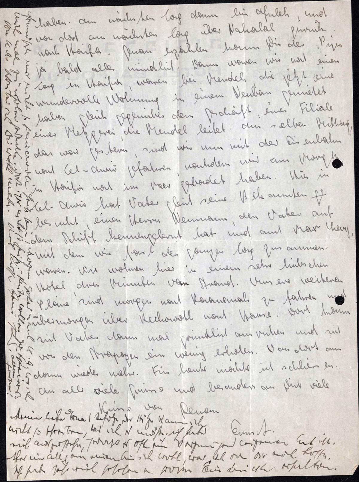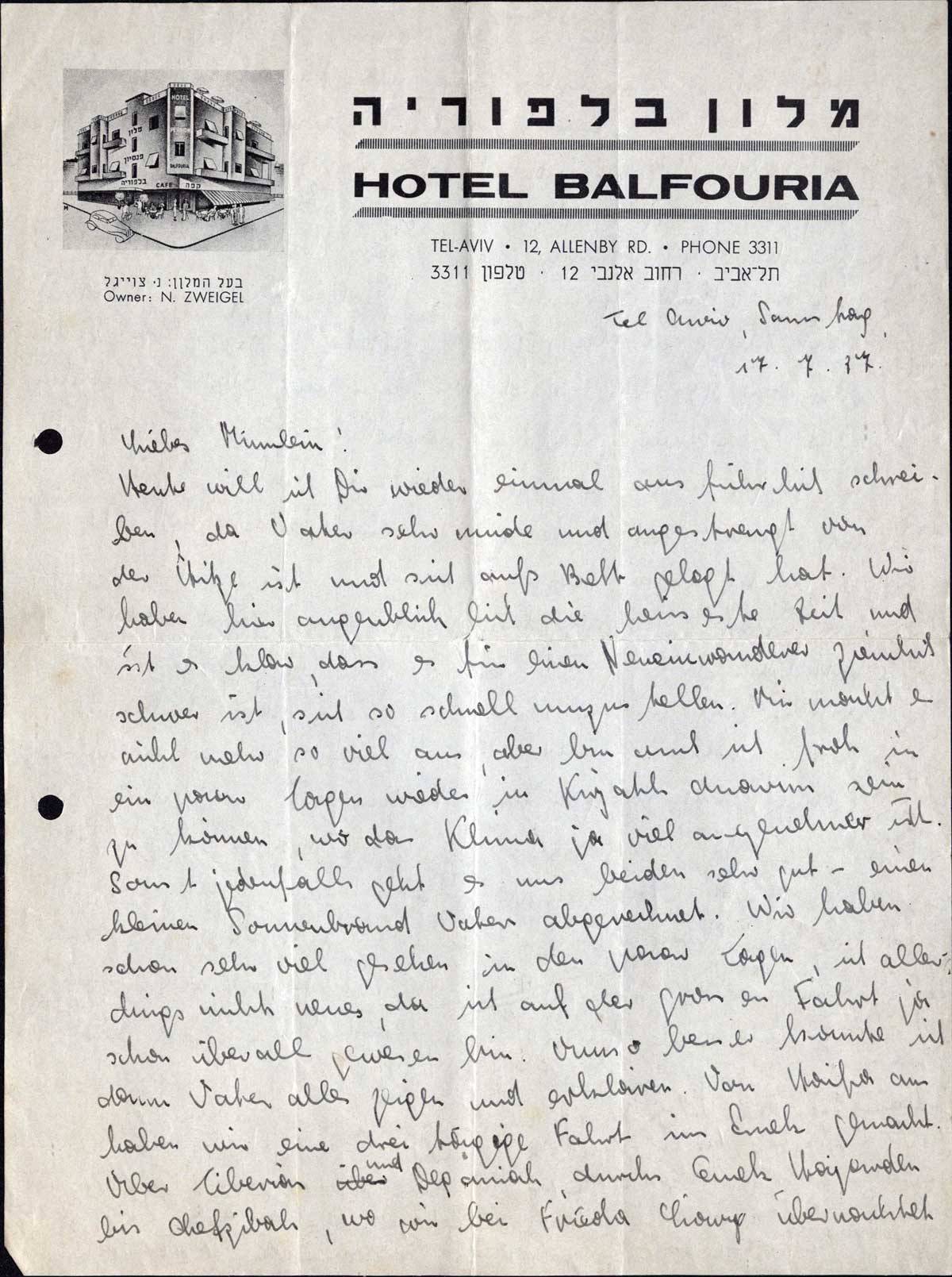 haben. Am nächsten Tag dann bis Afuleh, und von dort am nächsten Tag über Nahalal zurück nach Haifa. Genau erzählen kann Dir der Pips ja bald alles mündlich. Dann waren wir noch einen Tag in Haifa, waren bei Mendels, die jetzt eine wundervolle Wohnung in einem Neubau gemietet haben, gleich gegenüber dem Geschäft, einer Filiale einer Metzgerei, die Mendel leitet. Am selben Mittag, das war gestern, sind wir nun mit der Eisenbahn nach Tel-Aviv gefahren, nachdem wir am Morgen in Haifa noch im Meer gebadet haben. Hier in Tel-Aviv hat Vater gleich seine Bekannten besucht, einen Herrn Neumann, den Vater auf dem Schiff kennengelernt hat und auch Max Levy, mit dem wir fast den ganzen Tag zusammen waren. Wir wohnen hier in einem sehr hübschen Hotel, drei Minuten vom Strand. Unsere weiteren Pläne sind morgen nach Raananah zu fahren und übermorgen über Rechowoth nach Hause. Dort kann sich Vater kann mal gründlich ausruhen und sich von den Strapazen ein wenig erholen. Von dort aus dann wieder mehr. Für heute möchte ich schliessen. An alle viele Grüsse und besonders an Dich viele