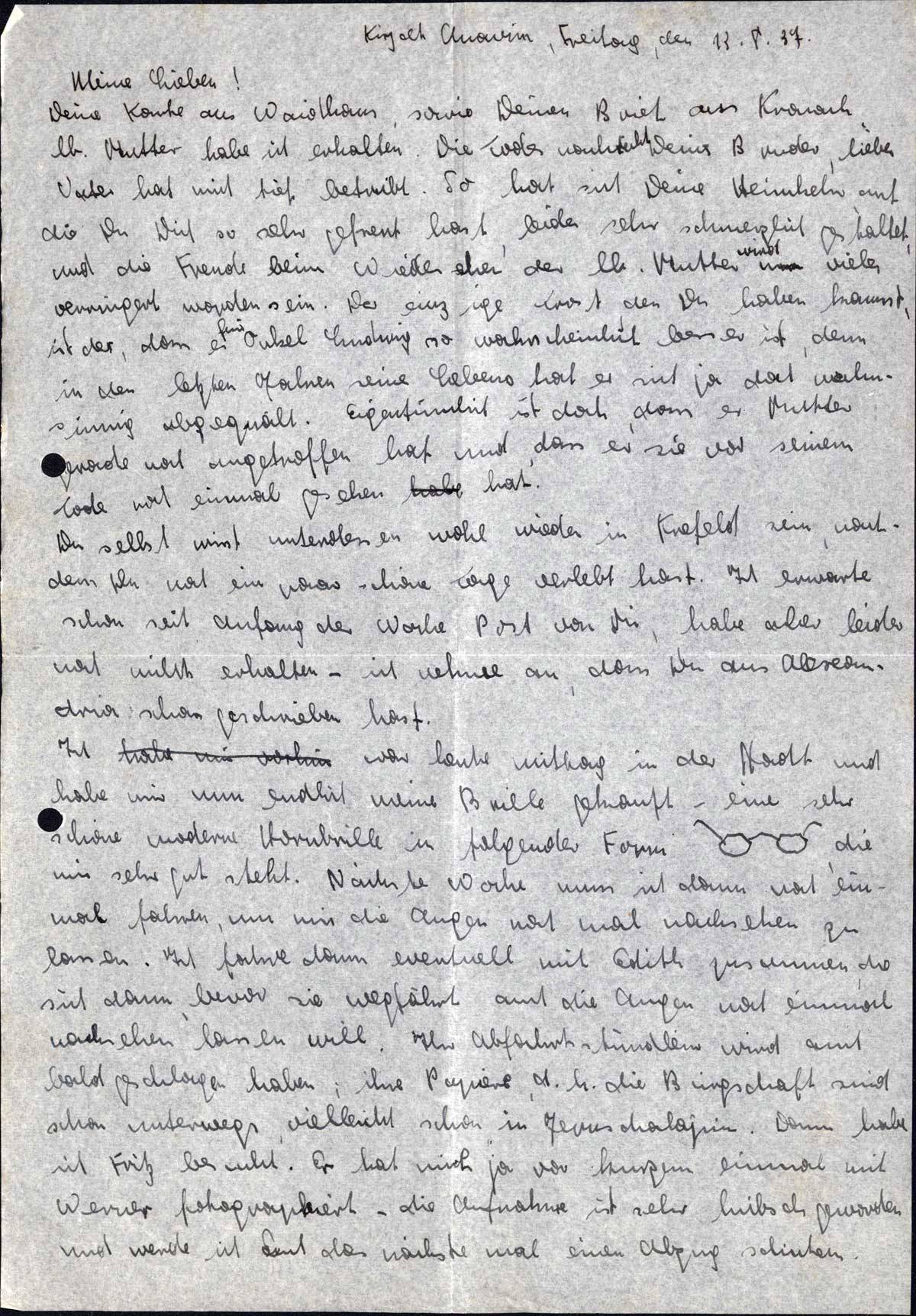 Ich war heute mittag in der Stadt und habe mir nun endlich meine Brille gekauft - eine sehr schöne moderne Hornbrille in folgender Form [..], die mir sehr gut steht. Nächste Woche muss ich dann noch einmal fahren, um mir die Augen noch mal nachsehen zu lassen. Ich fahre dann eventuell mit Edith zusammen, sie sich dann bevor sie wegfährt auch die Augen noch einmal nachsehen lassen will. Ihr Abfahrtsstündlein wird auch bald geschlagen haben; ihre Papiere, d. h. die Bürgschaft sind schon unterwegs, vielleicht schon in Jeruschalajim. Dann habe ich Fritz besucht. Er hat mich ja vor kurzem einmal mit Werner fotographiert - die Aufnahme ist sehr hübsch geworden und werde ich Euch das nächste Mal einen Abzug schicken.