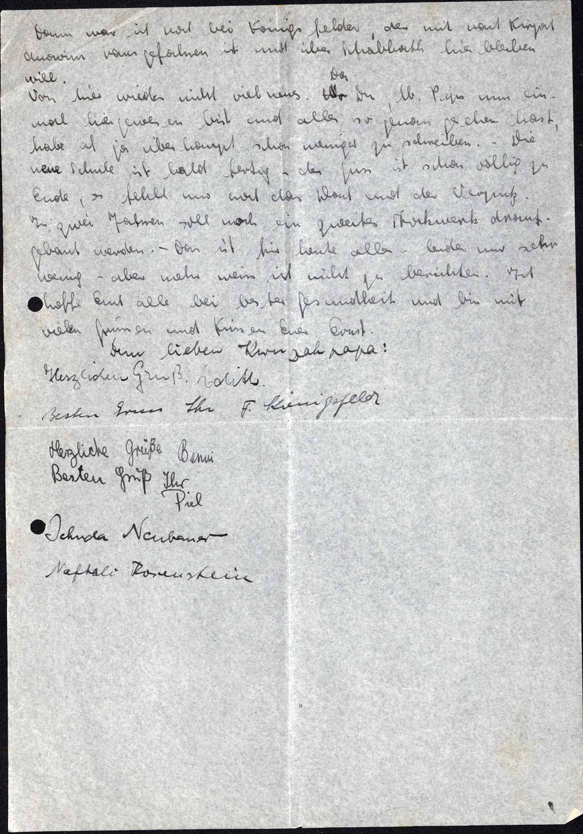 Von hier wieder nicht viel neues. Da Du, lb. Pips, nun einmal hiergewesen bist und alles so genau gesehen hast, habe ich ja überhaupt schon weniger zu schreiben. - Die neue Schule ist bald fertig - der Guss ist schon völlig zu Ende, es fehlt nur noch das Dach und der Verputz. In zwei Jahren soll noch ein zweites Stockwerk draufgebaut werden. - Das ist hier heute alles - leider nur sehr wenig - aber mehr weiss ich nicht zu berichten. Ich hoffe Euch alle bei bester Gesundheit und bin mit vielen Grüssen und Küssen Euer Ernst.