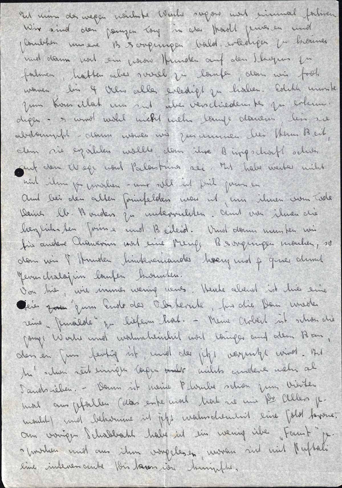 Von hier, wie immer wenig neues. Heute abend ist hier eine Feier zum Ende der Obsternte, für die Dan wieder seine „Gemälde” zu liefern hat. - Meine Arbeit ist schon die ganze Woche und wahrscheinlich noch länger auf dem Bau, dessen Guss fertig ist, und der jetzt verputzt wird. Ich tu' schon seit einigen Tagen nichts anderes mehr als Sandsieben. - Dann ist meine Plombe schon zum vierten Mal ausgefallen (das erste Mal hat sie mir Dr. Allers gemacht) und bekomme ich jetzt wahrscheinlich eine Goldkrone. - Am vorigen Schabbath habe ich ein wenig über „Faust” gesprochen und aus ihm vorgelesen, woran sich mit Naftali eine interessante Diskussion knüpfte.