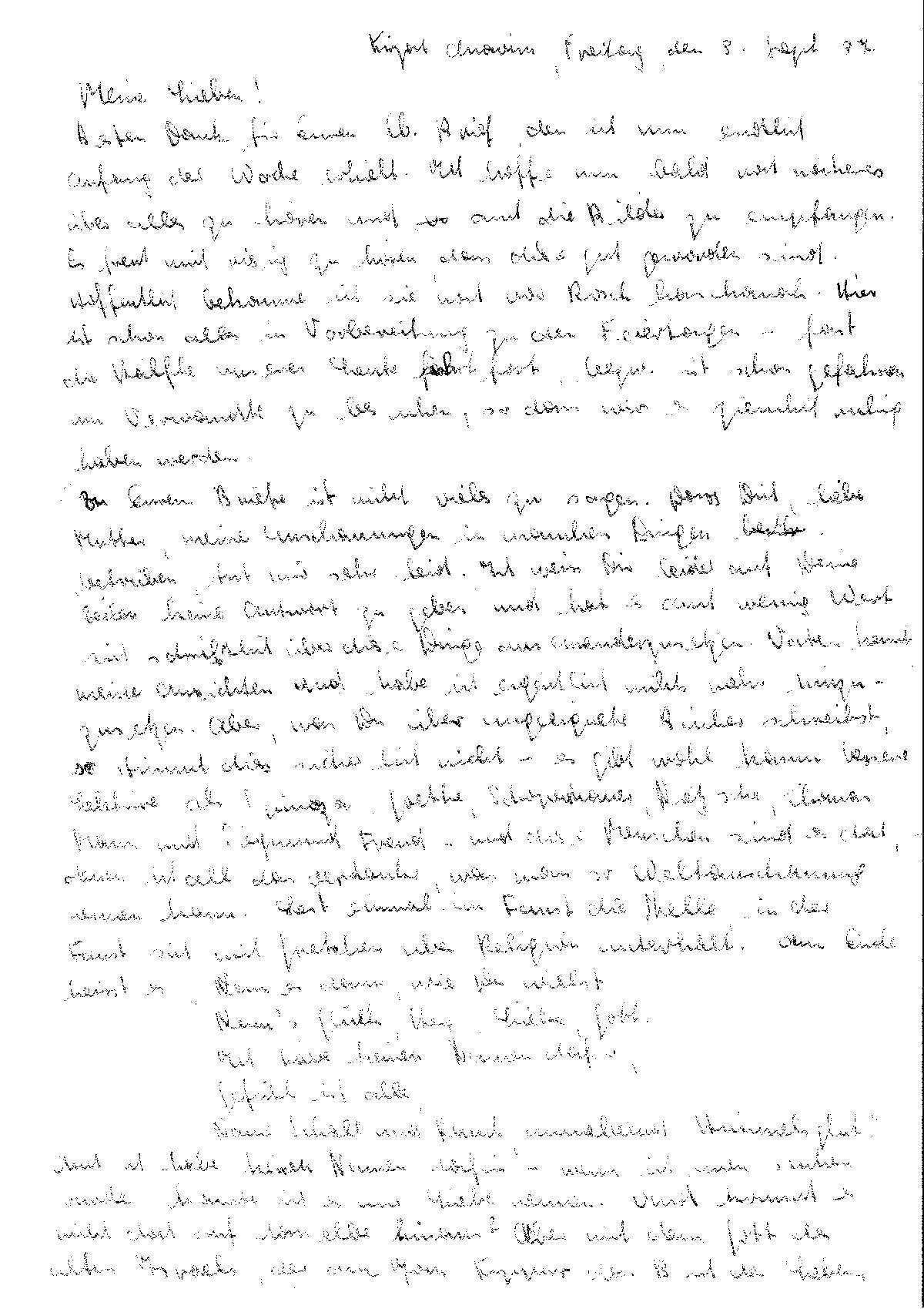 Zu Eurem Briefe ist nicht vieles zu sagen. Dass Dich, liebe Mutter, meine Anschauungen in manchen Dingen betrüben, tut mir sehr leid. Ich weiss Dir leider auf Deine Zeilen keine Antwort zu geben, und hat es auch wenig Wert, sich schriftlich über diese Dinge auseinanderzusetzen. Vater kennt meine Ansichten, und habe ich eigentlich nichts mehr hinzuzusetzen. Aber, was Du über ungeeignete Bücher schreibst, so stimmt dies sicherlich nicht - es gibt wohl kaum bessere Lektüre als Spinoza, Goethe, Schopenhauer, Nietzsche, Thomas Mann und Sigmund Freud - und diese Menschen sind es doch, denen ich all das verdanke, was man so Weltanschauung nennen kann. Lest einmal im Faust die Stelle, in der Faust sich mit Gretchen über Religion unterhält. Am Ende heißt es