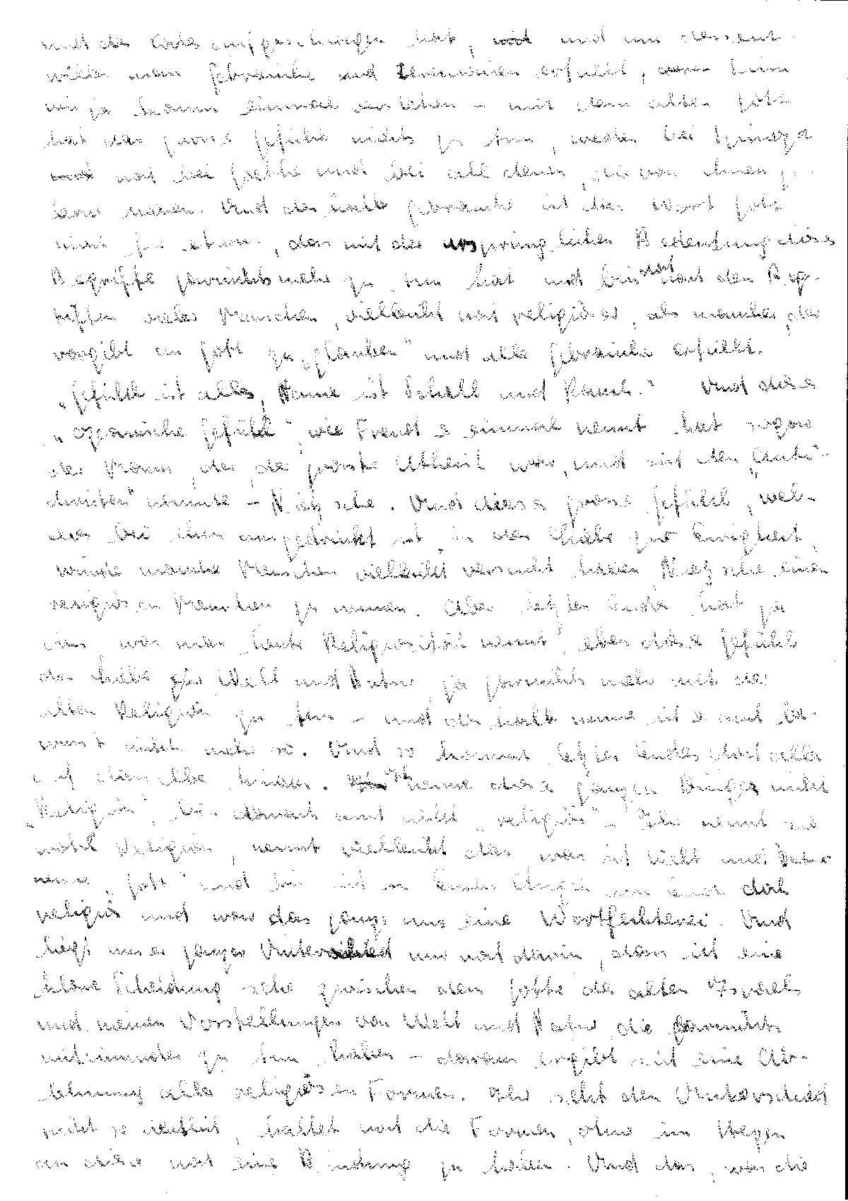 und des Todes aufgeschlagen hat, und um dessentwillen man Gebräuche und Zeremonien erfüllt, deren Sinn wir ja kaum einmal verstehen - mit dem alten Gott hat das grosse Gefühl nichts zu tun, weder bei Spinoza noch bei Goethe und bei all denen, die von ihnen gelernt haben. Und deshalb gebrauche ich das Wort Gott nicht für etwas, das mit der ursprünglichen Bedeutung dieses Begriffes gar nichts mehr zu tun hat, und bin doch nach den Begriffen vieler Menschen vielleicht noch religiöser als mancher, der vorgibt, an Gott zu „glauben“ und alle Gebräuche erfüllt. „Gefühl ist alles, Name ist Schall und Rauch.“ Und dieses „ozeanische Gefühl“, wie Freud es einmal nennt, hat sogar der Mann, der der grösste Atheist war und sich den „Antichristen“ nannte - Nietzsche. Und dieses grosse Gefühl, welches bei ihm ausgedrückt ist in der Liebe zur Ewigkeit, würde manche Menschen vielleicht veranlasst haben, Nietzsche einen religiösen Menschen zu nennen. Aber letzten Endes hat ja das, was man heute Religiosität nennt, eben dieses Gefühl der Liebe zur Welt und Natur, ja gar nichts mehr mit der alten Religion zu tun - und deshalb nenne ich es auch bewusst nicht mehr so. Und so kommt letzten Endes doch alles auf dasselbe hinaus. Ich nenne diese ganzen Dinge nicht „Religion“, bin danach auch nicht „religiös“ - Ihr nennt sie wohl Religion, nennt vielleicht das, was ich Welt und Natur nenne, „Gott“, und bin ich in Euren Augen am Ende doch religiös und war das Ganze nur eine Wortfechterei. Und liegt unser ganzer Unterschied nur noch darin, dass ich eine klare Scheidung sehe zwischen dem Gotte des alten Israels und meinen Vorstellungen von Welt und Natur, die gar nichts miteinander zu tun haben - daraus ergibt sich eine Ablehnung aller religiösen Formen. Ihr seht den Unterschied nicht so deutlich, haltet noch die Formen, ohne im Herzen an diese noch eine Bindung zu haben. Und das, was die