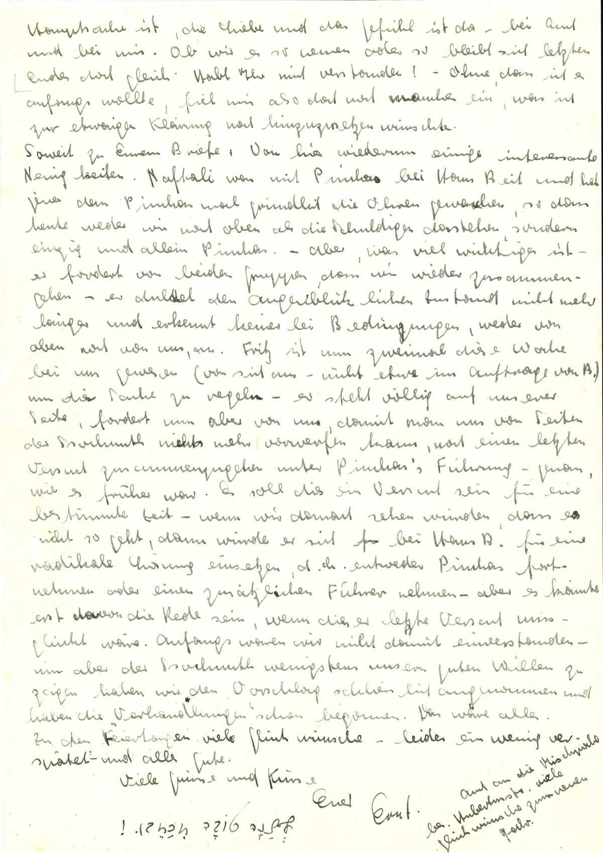 Soweit zu Eurem Briefe. Von hier wiederum einige interessante Neuigkeiten. Naftali war mit Pinchas bei Hans Beit, und hat jener dem Pinchas mal gründlich die Ohren gewaschen, so dass heute weder wir noch oben als die Schuldigen dastehen, sondern einzig und allein Pinchas. - Aber, was viel wichtiger ist - er fordert von beiden Gruppen, dass wir wieder zusammengehen - er duldet den augenblicklichen Zustand nicht mehr länger und erkennt keinerlei Bedingungen, weder von oben noch von uns, an. Fritz ist nun zweimal diese Woche bei uns gewesen (von sich aus - nicht etwa im Aufträge von B.), um die Sache zu regeln - er steht völlig auf unserer Seite, fordert nun aber von uns, damit man uns von Seiten der Sochnuth nichts mehr vorwerfen kann, noch einen letzten Versuch, zusammenzugehen unter Pinchas’ Führung - genau, wie es früher war. Es soll dies ein Versuch sein für eine bestimmte Zeit - wenn wir danach sehen würden, dass es nicht so geht, dann würde er sich bei Hans B. für eine radikale Lösung einsetzen, d. h. entweder Pinchas fortnehmen oder einen zusätzlichen Führer nehmen - aber es könnte erst davon die Rede sein, wenn dieser letzte Versuch missglückt wäre. Anfangs waren wir nicht damit einverstanden - um aber der Sochnuth wenigstens unsern guten Willen zu zeigen, haben wir den Vorschlag schliesslich angenommen und haben die „Verhandlungen“ schon begonnen. Das wäre alles.