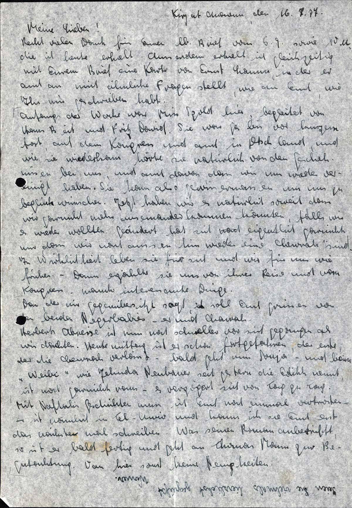Herberts Abreise ist nun noch schneller vor sich gegangen als wir dachten. Heute mittag ist er schon fortgefahren, der erste, der die Chewrah verlässt - bald geht nun Sonja - und beim „Weibi”, wie Jehuda Neubauer seit gestern die Edith nennt, ist noch garnichts raus - es verzögert sich von Tag zu Tag. Mit Naftalis Geschichten muss ich Euch noch einmal vertrösten - er ist nämlich in Tel-Aviv und kann ich sie Euch erst das nächste Mal schreiben. Was seinen Roman anbetrifft, so ist er bald fertig und geht an Thomas Mann zur Begutachtung. Von hier sonst keine Neuigkeiten.