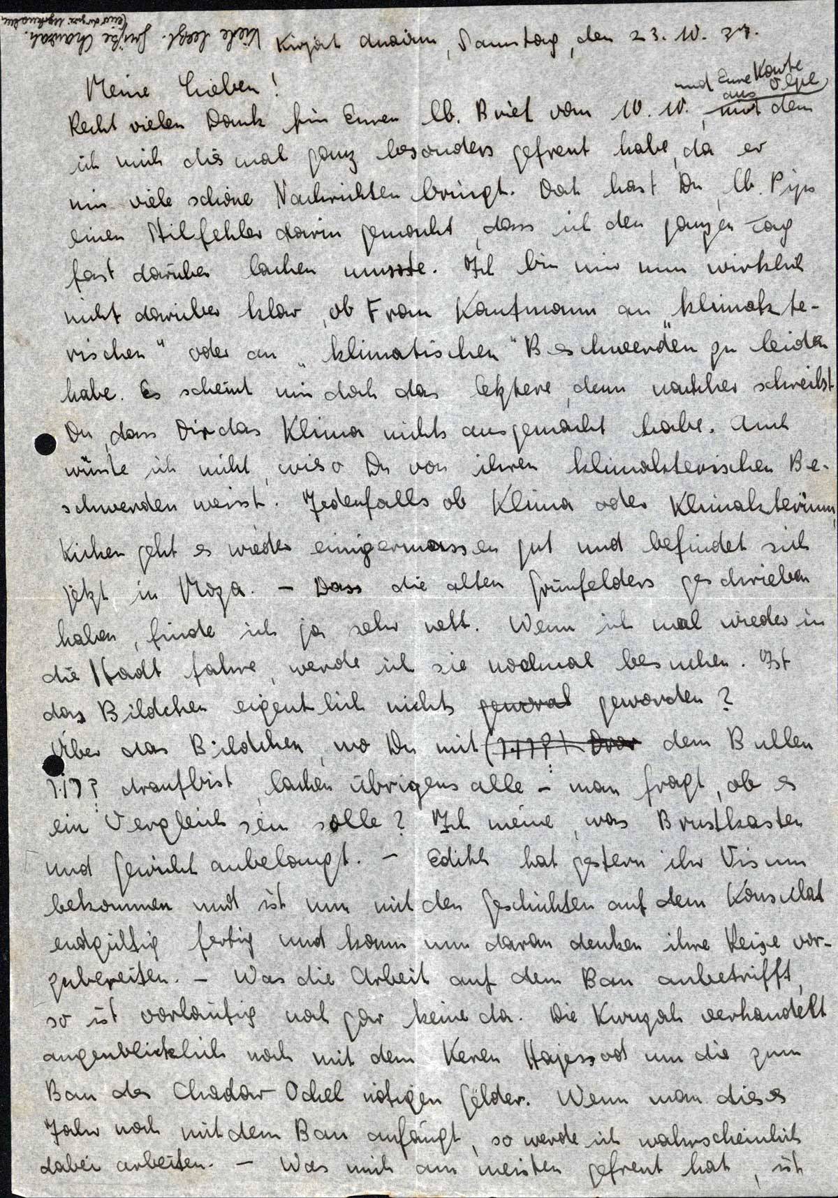 Recht vielen Dank für Euren lb. Brief vom 10.10. udn Eure Karte aus Olpe, mit dem ich mich diesmal ganz besonders gefreut habe, da er mir viele schöne Nachrichten bringt. Doch hast Du, lb. Pips, einen Stilfehler darin gemacht, dass ich den ganzen Tag fast darüber lachen musste. Ich bin mir nun wirklich nicht darüber klar, ob Frau Kaufmann an „klimakterischen” oder an „klimatischen” Beschwerden zu leiden habe. Es scheint mir doch das letztere, denn nachher schreibst Du, dass Dir das Klima nichts ausgemacht habe. Auch wüsste ich nicht, wieso Du von ihren klimakterischen Beschwerden weisst. Jedenfalls ob Klima oder Klimakterium, Küken geht es wieder einigermassen gut und befindet sich jetzt in Moza. - Dass die alten Grünfelders geschrieben haben, finde ich ja sehr nett. Wenn ich mal wieder in die Stadt fahre, werde ich sie nochmal besuchen. Ist das Bildchen eigentlich nichts geworden?
