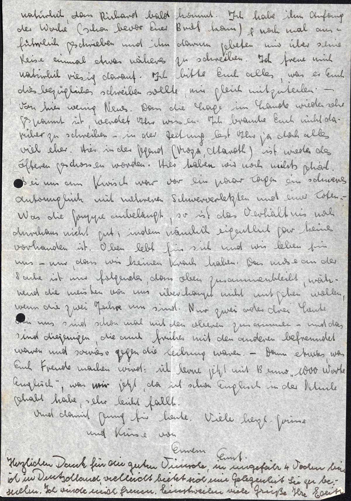 Bei uns am Kwisch war vor ein paar Tagen ein schweres Autounglück mit mehreren Schwerverletzten und einer Toten. - Was die Gruppe anbelangt, so ist das Verhältnis noch durchaus nicht gut, indem nämlich eigentlich gar keines vorhanden ist. Oben lebt für sich und wir leben für uns - nur, dass wir keinen Krach haben. Das miese an der Sache ist nur folgendes, dass oben zusammenbleibt, während die meisten von uns überhaupt nicht mitgehen wollen, wenn die zwei Jahre um sind. Nur zwei oder drei Leute von uns sind schon mal mit den oberen zusammen - und das sind diejenigen, die auch früher mit den anderen befreundet waren und sowieso gegen die Teilung waren. - Dann etwas, was Euch Freude machen wird: ich lerne jetzt mit Benno „1000 Worte Englisch”, was wir jetzt, da ich schon Englisch in der Schule gehabt habe, sehr leicht fällt.