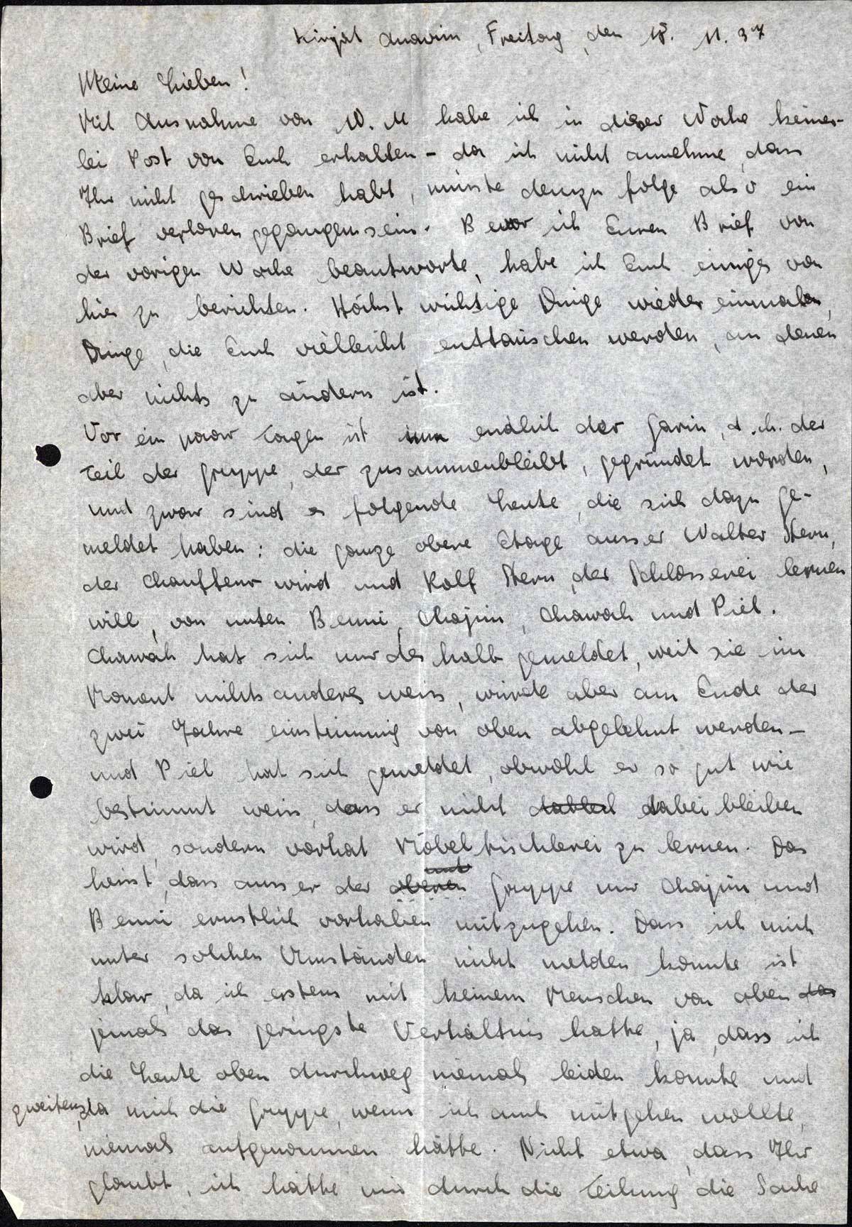 Vor ein paar Tagen ist nun endlich der Garin, d. h. der Teil der Gruppe, der zusammenbleibt, gegründet worden, und zwar sind es folgende Leute, die sich dazu gemeldet haben: die ganze obere Etage ausser Walter Stern, der Chauffeur wird, und Rolf Stern, der Schlosserei lernen will, von unten Benni, Chajim, Chawah und Piel.