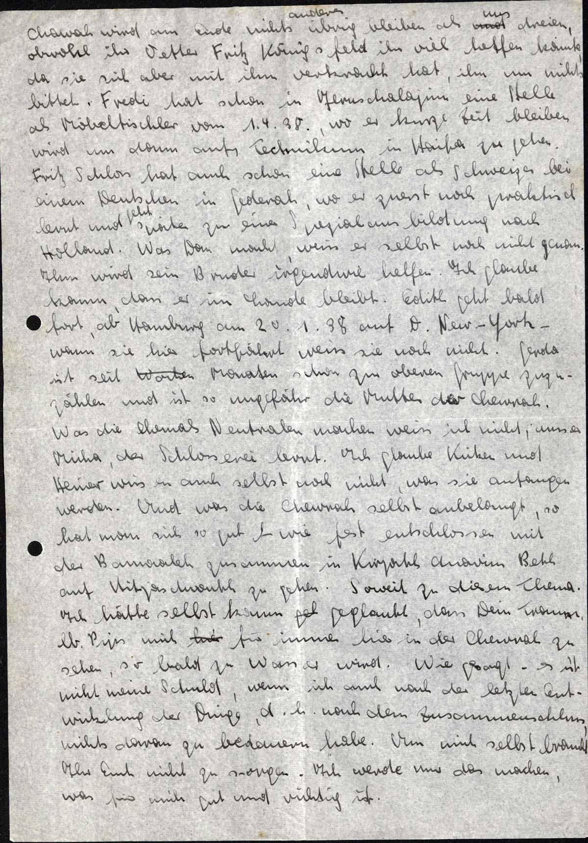 Chawah wird am Ende nichts anderes übrig bleiben als uns dreien, obwohl ihr Vetter Fritz Königsfeld ihr viel helfen könnte, da sie sich aber mit ihm verkracht hat, ihn nun nicht bittet. Fredi hat schon in Jeruschalajim eine Stelle als Möbeltischler vom 1.4.38., wo er kurze Zeit bleiben wird, um dann aufs Technikum in Haifa zu gehen. Fritz Schloss hat auch schon eine Stelle als Schweizer bei einem Deutschen in Gederah, wo er zuerst noch praktisch lernt und geht später zu einer Spezialausbildung nach Holland. Was Dan macht, weiss er selbst noch nicht genau. Ihm wird sein Bruder irgendwie helfen. Ich glaube kaum, dass er im Lande bleibt. Edith geht bald fort, ab Hamburg am 20.1.38 auf D. New York - wann sie hier fortfährt, weiss sie noch nicht. Gerda ist seit Monaten schon zur oberen Gruppe zuzuzählen und ist so ungefähr die Mutter der Chewrah.