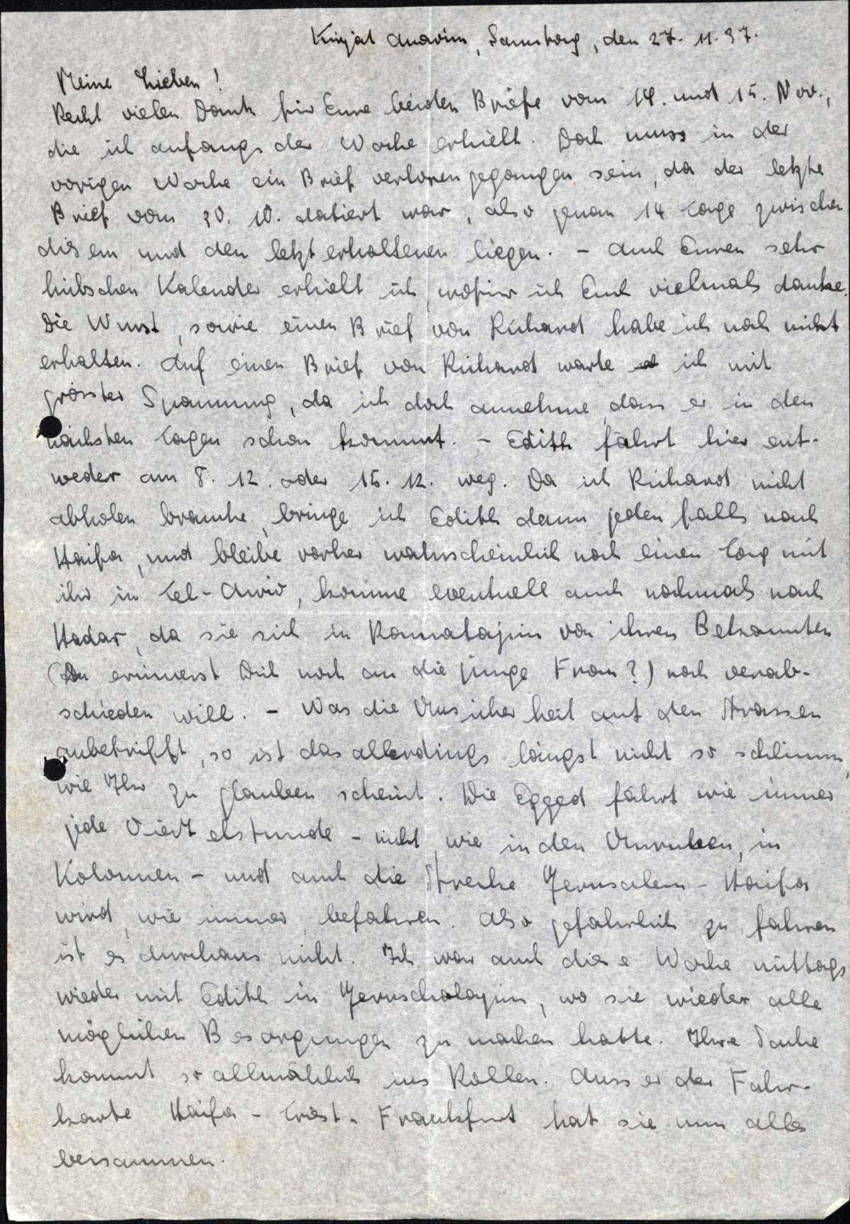 Recht vielen Dank für Eure beiden Briefe vom 14. und 15. Nov., die anfangs der Woche erhielt. Doch muss in der vorigen Woche ein Brief verlorengegangen sein, da der letzte Brief vom 30.10. datier war, also genau 14 Tage zwischen diesem und den letzterhaltenen liegen. - Auch Euren sehr hübschen Kalender erhielt ich, wofür ich Euch vielmals danke. Die Wurst, sowie einen Brief von Richard habe ich noch nicht erhalten. Auf einen Brief von Richard warte ich mit grösster Spannung, da ich doch annehme, dass er in den nächsten Tagen schon kommt. - Edith fährt hier entweder am 8.12. oder 15.12. weg. Da ich Richard nicht abholen brauche, bringe ich Edith dann jedenfalls nach Haifa, und bleibe vorher wahrscheinlich noch einen Tag mit ihr in Tel-Aviv, komme eventuell auch nochmals nach Hadar, da sie sich in Ramatajim von ihren Bekannten (Du erinnerst Dich noch an die junge Frau?) noch verabschieden will. - Was die Unsicherheit auf den Strassen anbetrifft, so ist das allerdings längst nicht so schlimm, wie Ihr zu glauben scheint. Die Egged fährt wie immer jede Viertelstunde - nicht, wie in den Unruhen, in Kolonnen - und auch die Strecke Jerusalem-Haifa wird, wie immer befahren. Also gefährlich zu fahren ist es durchaus nicht. Ich war auch diese Woche mittags wieder mit Edith in Jeruschalajim, wo sie wieder alle möglichen Besorgungen zu machen hatte. Ihre Sache kommt so allmählich ins Rollen. Ausser der Fahrkarte Haifa-Triest-Frankfurt hat sie nun alles beisammen.