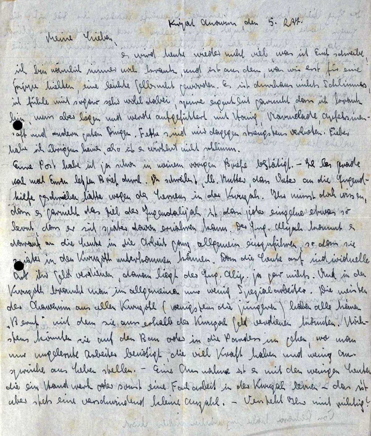 Eure Post habe ich ja schon in meinem vorigen Briefe bestätigt. - Ich las gerade noch mal Euren letzten Brief durch. Du schreibst, lb. Mutter, dass Vater an die Jugendhilfe geschrieben hätte wegen des Lernens in der Kwuzah. Ihr müsst doch wissen, dass es garnicht das Ziel der Jugendalijah ist, dass jeder einzelne etwas so lernt, dass er sich später davon ernähren kann. Der Jug. Alijah kommt es darauf an die Leute in die Arbeit ganz allgemein einzuführen, so dass sie später in den Kwuzoth unterkommen können. Dass die Leute auf individuelle Art ihr Geld verdienen, daran liegt der Jug. Alij. ja gar nichts. Und in den Kwuzoth braucht man im allgemeinen nur wenig Spezialarbeiter. Die meisten der Chawerim aus allen Kwuzoth (wenigstens die jüngeren) haben alle keinen „Beruf” mit dem sie ausserhalb der Kwuzah Geld verdienen könnten. Höchstens könnten sie auf den Bau oder in die Pardessim gehen, wo man nur ungelernte Arbeiter benötigt, die viel Kraft haben und wenig Ansprüche ans Leben stellen. - Eine Ausnahme ist es mit den wenigen Leuten, die ein Handwerk oder sonst eine Facharbeit in der Kwuzah lernen - das ist aber stets eine verschwindend kleine Anzahl. - Versteht Ihr mich richtig?