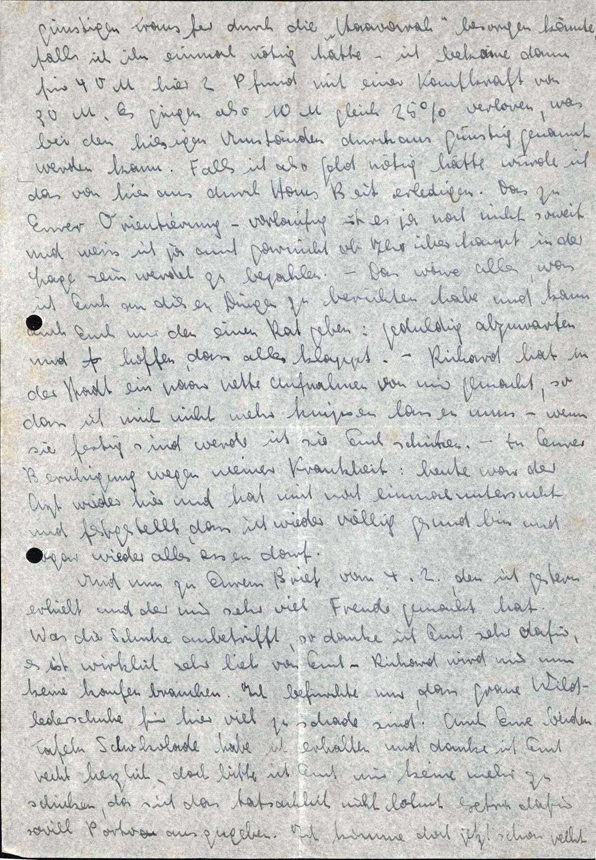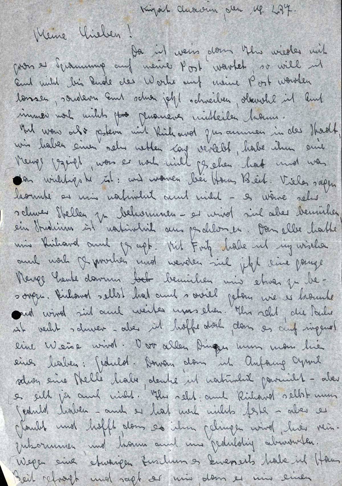 Ich war also gestern mit Richard zusammen in der Stadt, wir haben einen sehr netten Tag verlebt, habe ihm eine Menge gezeigt, was er noch nicht gesehen hat und was das wichtigste ist: wir waren bei Hans Beit. Vieles sagen konnte er mir natürlich auch nicht - es wäre sehr schwer Stellen zu bekommen - er wird sich aber bemühen, ein Studium ist natürlich ausgeschlossen. Dasselbe hatte mir Richard auch gesagt. Mit Fritz habe ich inzwischen auch noch gesprochen, und werden sich jetzt eine ganze Menge Leute darum bemühen mir etwas zu besorgen. Richard selbst hat auch soviel getan wie er konnte und wird sich auch weiter umsehen. Ihr seht, die Sache ist recht schwer - aber ich hoffe doch, dass es auf irgend eine Weise wird. Vor allen Dingen muss man hier eines haben: Geduld. Daran, dass ich Anfang April schon eine Stelle habe, denke ich natürlich garnicht - aber es eilt ja auch nicht. Ihr seht: auch Richard selbst muss Geduld haben - auch er hat noch nichts festes - aber er glaubt und hofft, dass es ihm gelingen wird, hier reinzukommen, und kann auch nur geduldig abwarten.