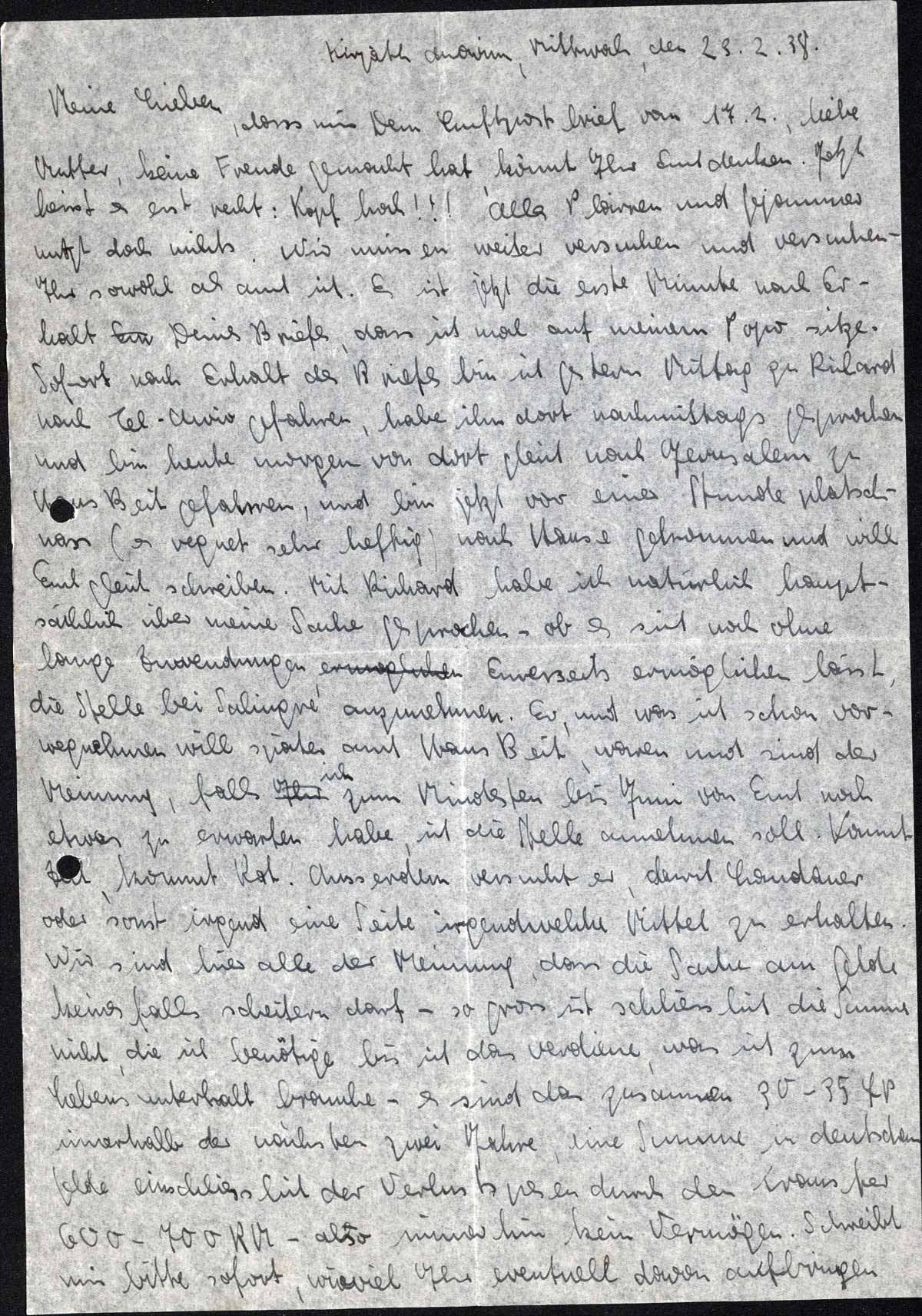 dass mir Dein Luftpostbrief vom 17. 2., liebe Mutter, keine Freude gemacht hat, könnt Ihr Euch denken. Jetzt heisst es erst recht: Kopf hoch!!! Alles Plärren und Gejammer nützt doch nichts. Wir müssen weiter versuchen und versuchen - Ihr sowohl als auch ich. Es ist jetzt die erste Minute nach Erhalt Deines Briefes, dass ich mal auf meinem Pop sitze. Sofort nach Erhalt des Briefes bin ich gestern Mittag zu Richard nach Tel-Aviv gefahren, habe ihn dort nachmittags gesprochen und bin heute morgen von dort gleich nach Jerusalem zu Hans Beit gefahren, und bin jetzt vor einer Stunde platschnass (es regnet sehr heftig) nach Hause gekommen und will Euch gleich schreiben. Mit Richard habe ich natürlich hauptsächlich über meine Sache gesprochen - ob es sich auch ohne lange Zuwendungen Eurerseits ermöglichen lässt, die Stelle bei Salingré anzunehmen. Er, und was ich schon vorwegnehmen will, später auch Hans Beyth, waren und sind der Meinung, falls ich zum mindesten bis Juni von Euch noch etwas zu erwarten habe, ich die Stelle annehmen soll. Kommt Zeit, kommt Rat. Ausserdem versucht er, durch Landauer oder sonst irgend eine Seite irgendwelche Mittel zu erhalten. Wir sind hier alle der Meinung, dass die Sache am Gelde keinesfalls scheitern darf - so gross ist schliesslich die Summe nicht, die ich benötige bis ich das verdiene, was ich zum Lebensunterhalt brauche - es sind das zusammen 30-35 £P innerhalb der nächsten zwei Jahre, eine Summe in deutschem Gelde einschliesslich der Verlustspesen durch den Transfer 600-700 RM - also immerhin kein Vermögen. Schreibt mir bitte sofort, wieviel Ihr eventuell davon aufbringen