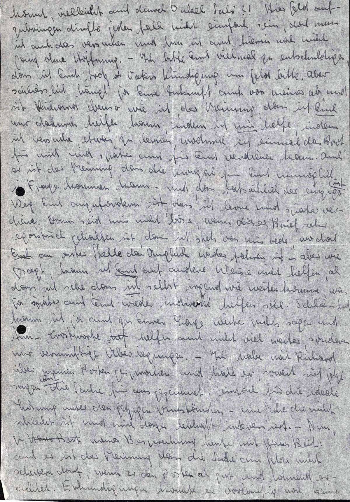 könnt, vielleicht auch durch Onkel Sali?! Hier Geld aufzubringen dürfte jedenfalls nicht einfach sein, doch muss ich auch das versuchen und bin ich auch hierin noch nicht ganz ohne Hoffnung. - Ich bitte Euch vielmals zu entschuldigen, dass ich Euch trotz Vaters Kündigung um Geld bitte. Aber schliesslich hängt ja Eure Zukunft auch von meiner ab, und ist Richard ebenso wie ich, der Meinung, dass ich Euch nur dadurch helfen kann, indem ich mir helfe, indem ich versuche, etwas zu lernen, wodurch ich einmal das Brot für mich und später auch für Euch verdienen kann. Auch er ist der Meinung, dass die Kwuzah für Euch unmöglich in Frage kommen kann - und, dass tatsächlich der einzige Weg Euch anzufordern, dass ich lerne und später verdiene. Drum seid mir nicht böse, wenn dieser Brief sehr egoistisch gehalten ist, dass ich stets von mir rede, wo doch Euch an erster Stelle das Unglück widerfahren ist - aber wie gesagt, kann ich Euch auf andere Weise nicht helfen, als dass ich sehe, dass ich selbst irgendwie weiterkomme, was ja später auch Euch wieder indirekt helfen soll. Schliesslich kann ich ja auch zu Eurer Lage weiter nichts sagen und tun - Trostworte helfen auch nicht viel weiter, sondern nur vernünftige Überlegungen. - Ich habe mit Richard über meinen Posten gesprochen und hält er, soweit sich jetzt sagen lässt, die Sache für ausgezeichnet, einfach für die ideale Lösung unter den jetzigen Umständen - eine Sache, die nicht schlecht ist, und mich dazu lebhaft interessiert. - Nun zu meiner Besprechung heute mit Hans Beit: auch er ist der Meinung, dass die Sache am Gelde nicht scheitern darf, wenn er den Posten als gut und lohnend erachtet. Erkundigungen konnte er vorläufig noch keine