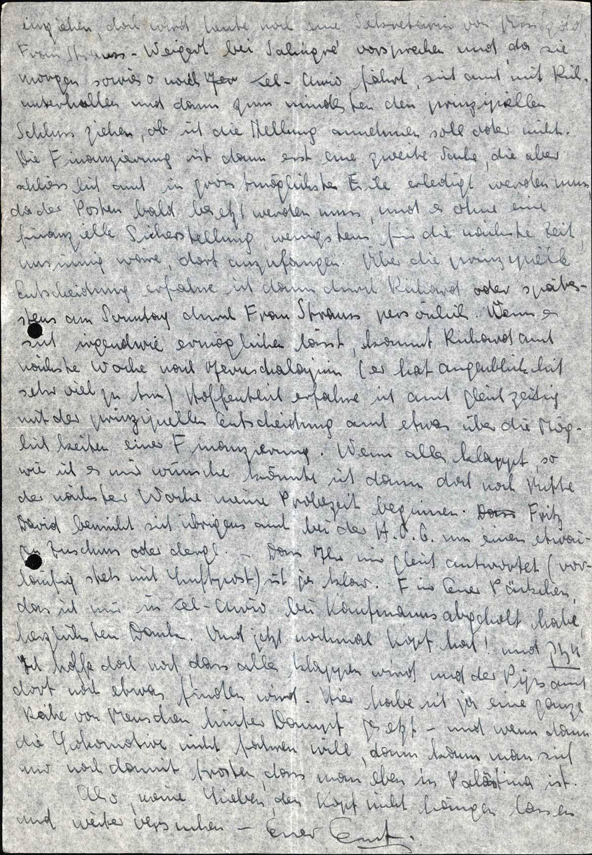 einziehen, doch wird heute noch eine Sekretärin von Miss Szold, Frau Strauss-Weigert bei Salingré vorsprechen und, da sie morgen sowieso nach Tel-Aviv fährt, sich auch mit Rich. unterhalten und dann zum mindesten den prinzipiellen Schluss ziehen, ob ich die Stellung annehmen soll oder nicht. Die Finanzierung ist dann erst eine zweite Sache, die aber schliesslich auch in grösstmöglicher Eile erledigt werden muss, da der Posten bald besetzt werden muss, und es ohne eine finanzielle Sicherstellung, wenigstens für die nächste Zeit, unsinnig wäre, dort anzufangen. Über die prinzipielle Entscheidung erfahre ich dann durch Richard oder spätestens am Sonntag durch Frau Strauss persönlich. Wenn es sich irgendwie ermöglichen lässt, kommt Richard auch nächste Woche nach Jeruschalajim (er hat augenblicklich sehr viel zu tun). Hoffentlich erfahre ich auch gleichzeitig mit der prinzipiellen Entscheidung auch etwas über die Möglichkeiten einer Finanzierung. Wenn alles klappt, so wie ich es mir wünsche, könnte ich dann doch noch Mitte der nächsten Woche meine Probezeit beginnen. Fritz David bemüht sich übrigens auch bei der H.O.G. um einen etwaigen Zuschuss oder dergl. - Dass Ihr mir gleich antwortet (vorläufig stets mit Luftpost) ist ja klar. Für Euer Päckchen, das ich mir in Tel-Aviv bei Kaufmanns abgeholt habe, herzlichsten Dank. Und jetzt nochmal Kopf hoch! und chasak! Ich hoffe doch noch, dass alles klappen wird und der Pips auch dort noch etwas finden wird. Hier habe ich ja eine ganze Reihe von Menschen hinter Dampf gesetzt - und wenn dann die Lokomotive nicht fahren will, dann kann man sich nur noch damit trösten, dass man eben in Palästina ist.