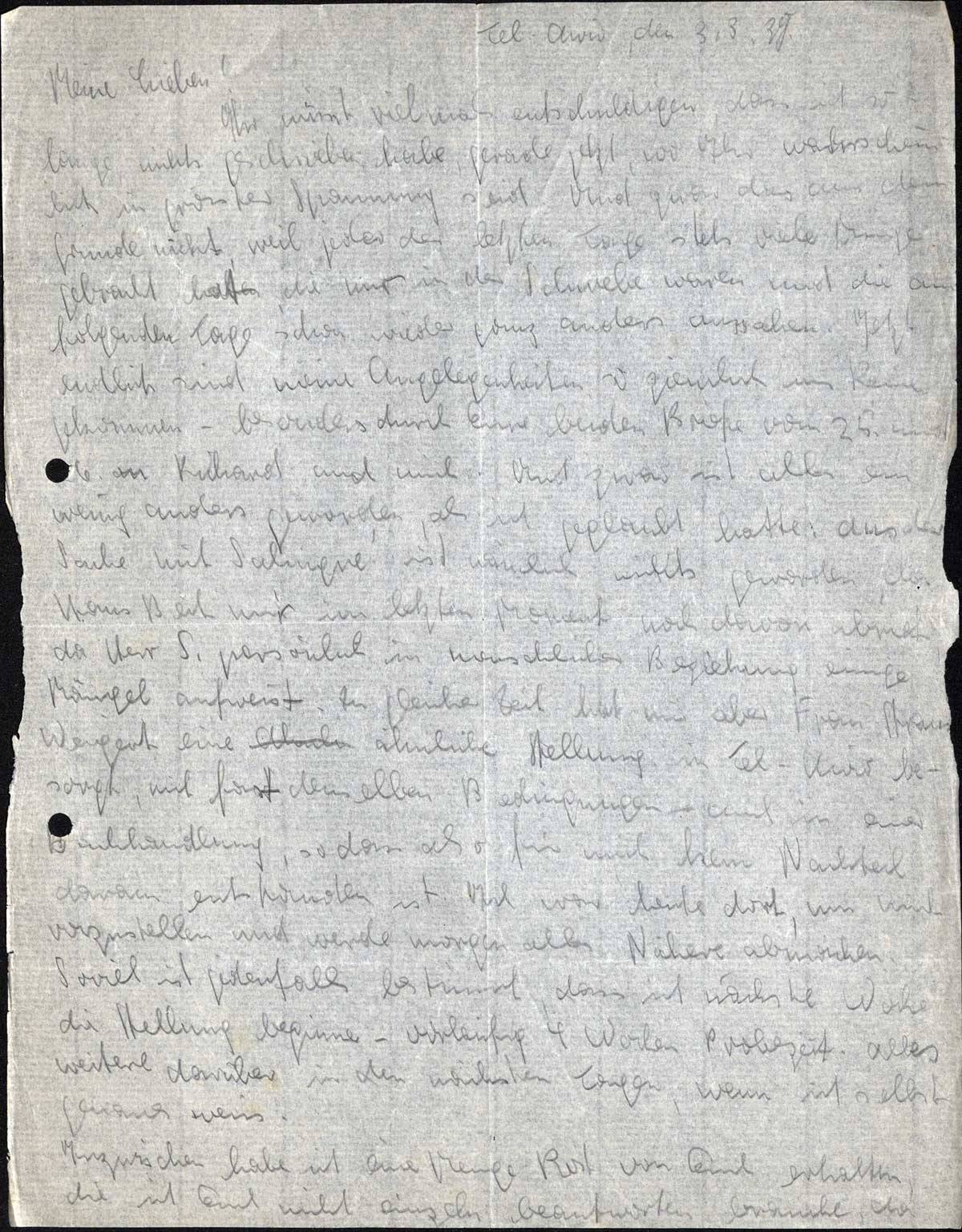 Ihr müsst vielmals entschuldigen, dass ich so lange nichts geschrieben habe, gerade jetzt, wo Ihr wahrscheinlich in grösster Spannung seid. Und zwar aus dem Grunde nicht, weil jeder der letzten Tage stets viele Dinge gebracht hat, die nur in der Schwebe waren und die am folgenden Tage schon wieder ganz anders aussahen. Jetzt endlich sind meine Angelegenheiten so ziemlich ins Reine gekommen - besonders durch Eure beiden Briefe vom 25. und 26. an Richard und mich. Und zwar ist alles ein wenig anders geworden, als ich geglaubt hatte: aus der Sache mit Salingré ist nämlich nichts geworden, da Hans Beit mir im letzten Moment noch davon abriet, da Herr S. persönlich in menschlicher Beziehung einige Mängel aufweist. Zu gleicher Zeit hat mir aber Frau Strauss-Weigert eine ähnliche Stellung in Tel-Aviv besorgt, mit fast denselben Bedingungen - auch in einer Buchhandlung, so dass also für mich kein Nachteil daraus entstanden ist. Ich war heute dort, um mich vorzustellen und werde morgen alles Nähere abmachen. Soviel ist jedenfalls bestimmt, dass ich nächste Woche die Stellung beginne - vorläufig 4 Wochen Probezeit. Alles weitere darüber in den nächsten Tagen, wenn ich selbst genaues weiss.
