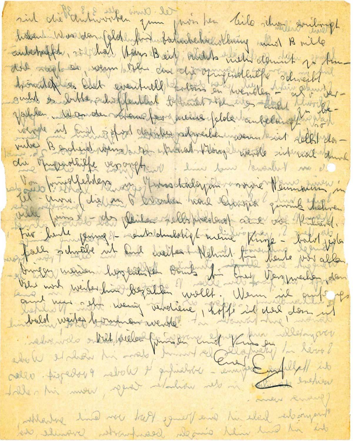 Für heute genug - entschuldigt meine Kürze - bald jedenfalls schreibe ich Euch weiter. Nehmt für heute vor allen Dingen meinen herzlichen Dank für Euer Versprechen, dass Ihr noch weiterhin bezahlen wollt. Wenn ich anfangs auch nur sehr wenig verdiene, hoffe ich doch, dass ich bald weiterkommen werde.