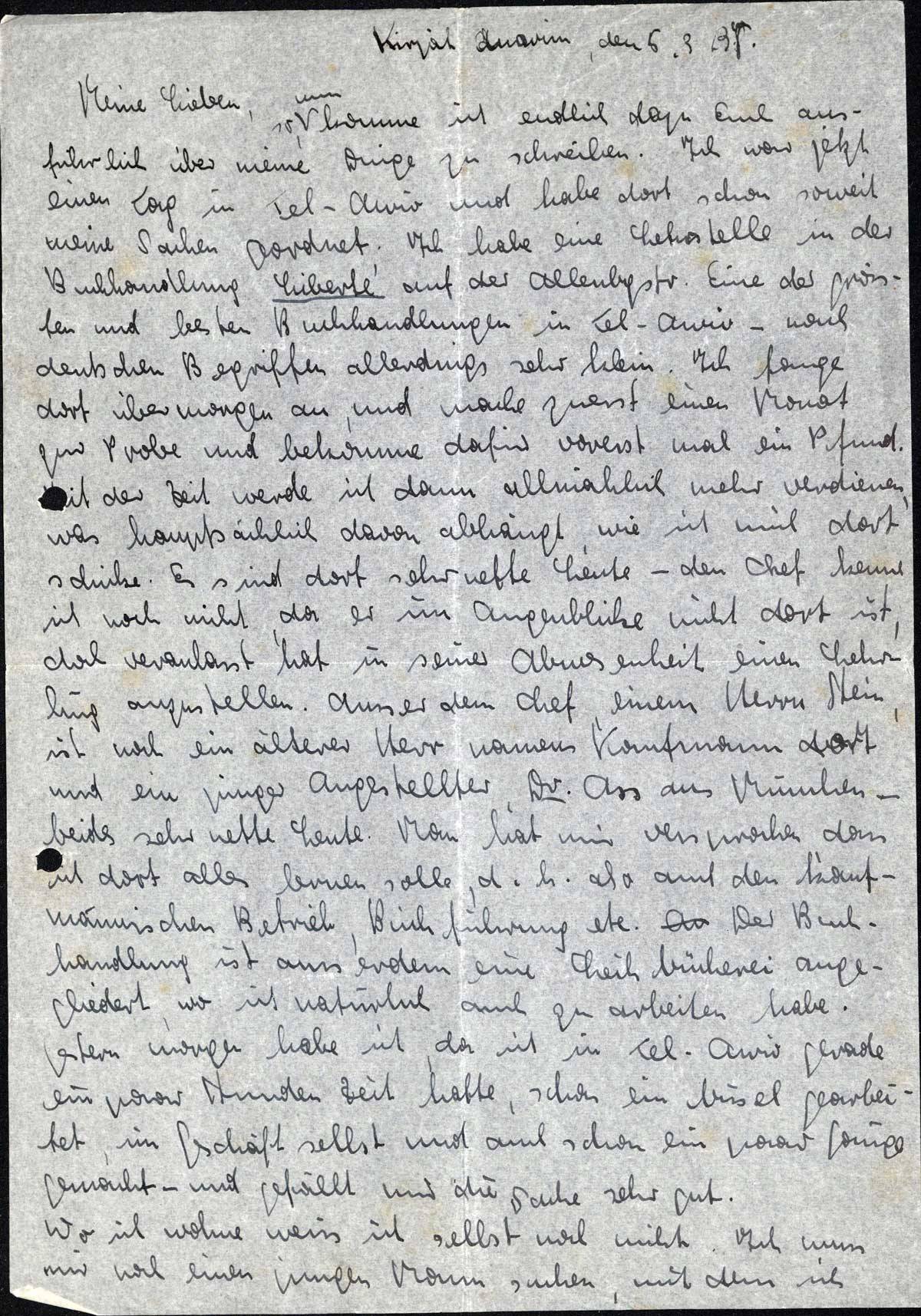 so, nun komme ich endlich dazu, Euch ausführlich über meine Dinge zu schreiben. Ich war jetzt einen Tag in Tel-Aviv und habe dort schon soweit meine Sachen geordnet. Ich habe eine Lehrstelle in der Buchhandlung Liberté auf der Allenbystr. Eine der grössten und besten Buchhandlungen in Tel-Aviv - nach deutschen Begriffen allerdings sehr klein. Ich fange dort übermorgen an, und mache zuerst einen Monat zur Probe und bekomme dafür vorerst mal ein Pfund. Mit der Zeit werde ich dann allmählich mehr verdienen, was hauptsächlich davon abhängt, wie ich mich dort schicke. Es sind dort sehr nette Leute - den Chef kenne ich noch nicht, da er im Augenblick nicht dort ist, doch veranlasst hat in seiner Abwesenheit einen Lehrling anzustellen. Ausser dem Chef, einem Herrn Stein, ist noch ein älterer Herr namens Kaufmann dort und ein junger Angestellter, Dr. Ass aus München - beides sehr nette Leute. Man hat mir versprochen, dass ich dort alles lernen solle, d. h. also auch den kaufmännischen Betrieb, Buchführung etc. Der Buchhandlung ist ausserdem eine Leihbücherei angegliedert, wo ich natürlich auch zu arbeiten habe. Gestern morgen habe ich, da ich in Tel-Aviv gerade ein paar Stunden Zeit hatte, schon ein bissel gearbeitet, im Geschäft selbst und auch schon ein paar Gänge gemacht - und gefällt mir die Sache sehr gut.
