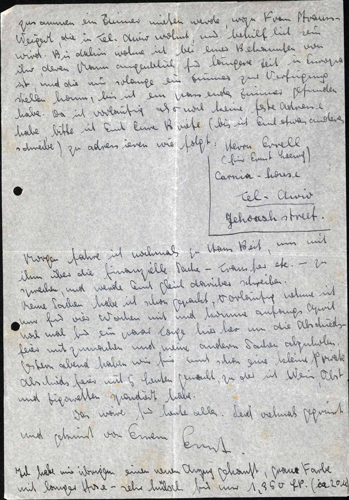 zusammen ein Zimmer mieten werde, wozu Frau Strauss-Weigert, die in Tel-Aviv wohnt, mir behilflich sein wird. Bis dahin wohne ich bei einer Bekannten von ihr, deren Mann augenblicklich für längere Zeit in Europa ist, und die mir solange ein Zimmer zur Verfügung stellen kann, bis ich ein passendes Zimmer gefunden habe. Da ich vorläufig also noch keine Adresse habe, bitte ich Euch Eure Briefe (bis ich Euch etwas anderes schreibe) zu adressieren wie folgt: