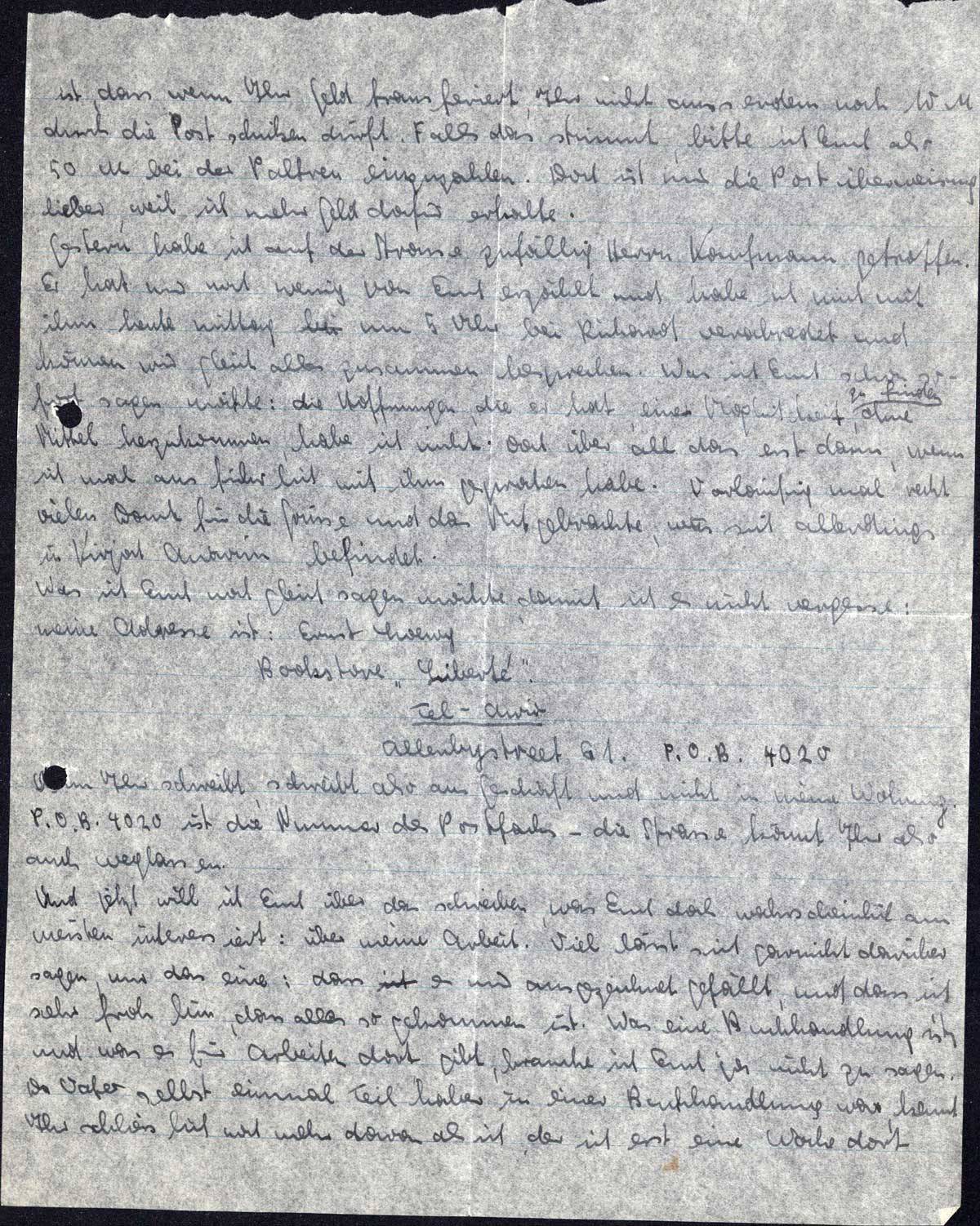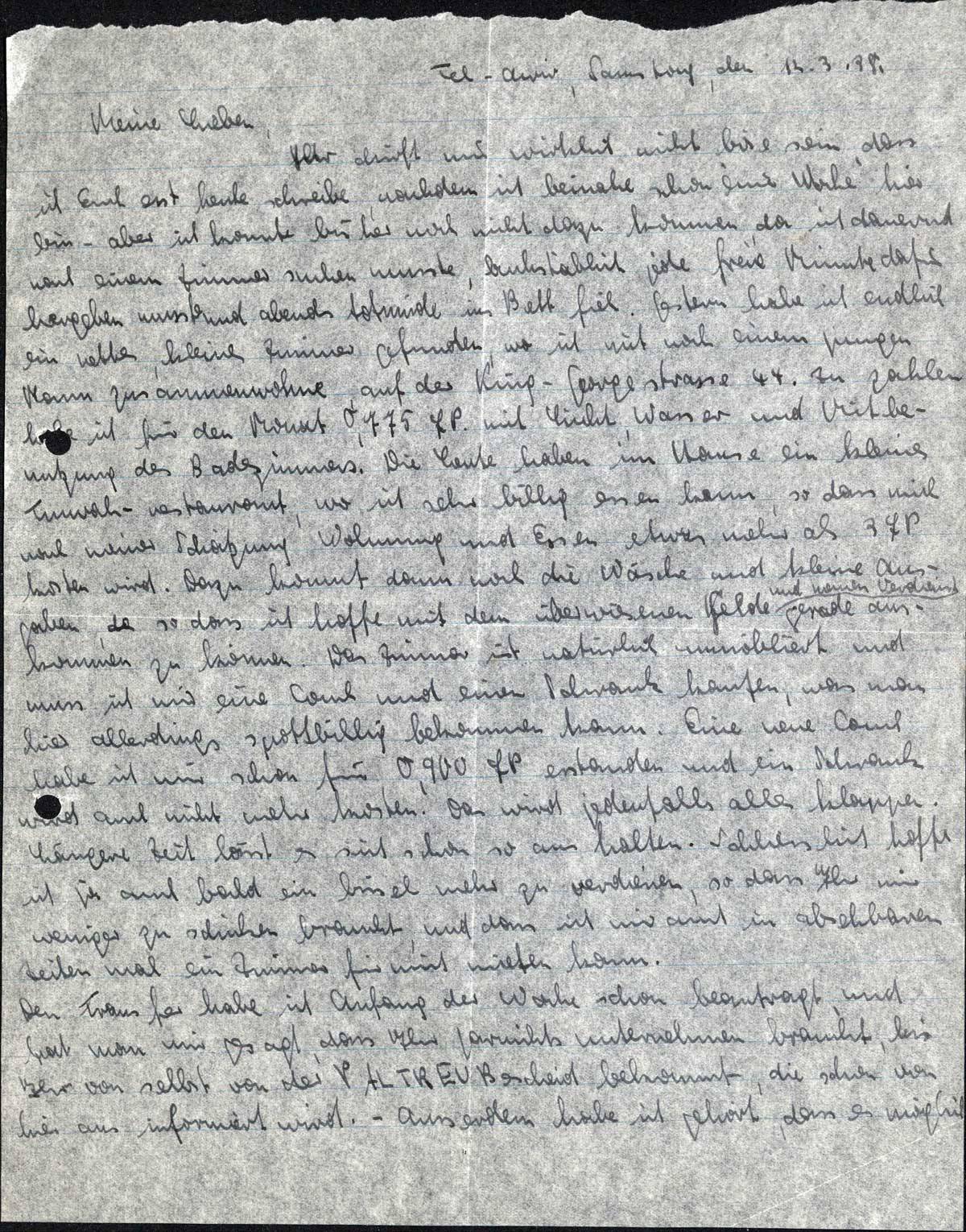 Ihr dürft mir wirklich nicht böse sein, dass ich Euch erst heute schreibe, nachdem ich beinahe schon eine Woche hier bin - aber ich konnte bisher noch nicht dazu kommen, da ich dauernd nach einem Zimmer suchen musste, buchstäblich jede freie Minute dafür hergeben musste und abends todmüde ins Bett fiel. Gestern habe ich endlich ein nettes kleines Zimmer gefunden, wo ich mit noch einem jungen Mann zusammen wohne, auf der King-George- Straße 44. Zu zahlen habe ich für den Monat 0,775 ₤P. mit Licht, Wasser und Mitbenutzung des Badezimmers. Die Leute haben im Hause ein kleines Tnuvah-restaurant, wo ich sehr billig essen kann, so dass nach meiner Schätzung Wohnung und Essen etwas mehr als 3 ₤P kosten wird. Dazu kommt dann noch die Wäsche und kleine Ausgaben, so dass ich hoffe mit dem überwiesenen Gelde und meinem Verdienst gerade auskommen zu können. Das Zimmer ist natürlich unmöbliert und muss ich mir eine Couch und einen Schrank kaufen, was man hier allerdings spottbillig bekommen kann. Eine neue Couch habe ich mir schon für 0,900 ₤P erstanden und ein Schrank wird auch nicht mehr kosten. Das wird jedenfalls alles klappen. Längere Zeit lässt es sich schon so aushalten. Schliesslich hoffe ich ja auch bald ein bissel mehr zu verdienen, so dass Ihr mir weniger zu schicken braucht, und dass ich mir auch in absehbaren Zeiten mal ein Zimmer für mich mieten kann.