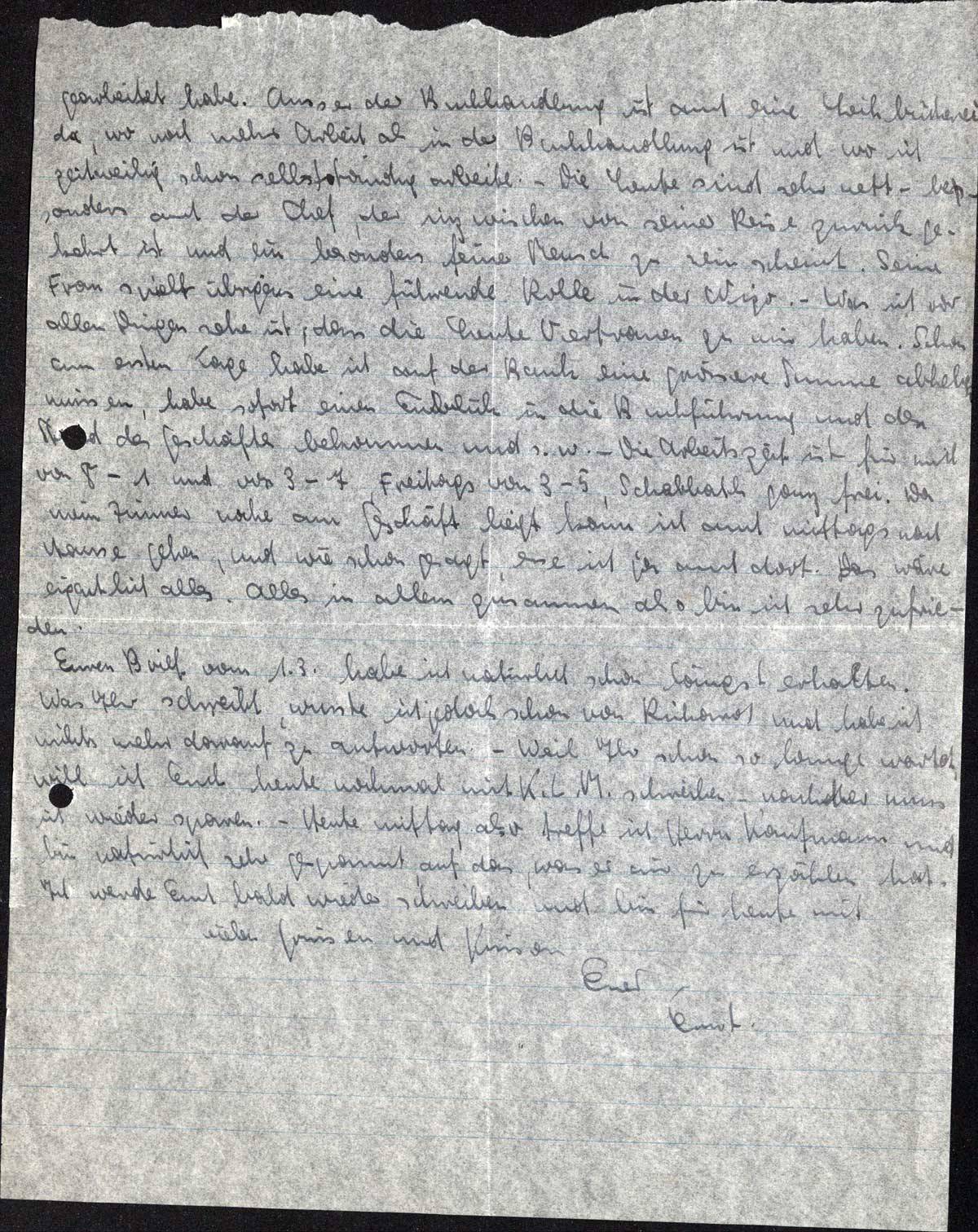 gearbeitet habe. Ausser der Buchhandlung ist auch eine Leihbücherei da, wo noch mehr Arbeit als in der Buchhandlung ist und wo ich zeitweilig schon selbständig arbeite. - Die Leute sind sehr nett - besonders auch der Chef, der inzwischen von seiner Reise zurückgekehrt ist und ein besonders feiner Mensch zu sein scheint. Seine Frau spielt übrigens eine führende Rolle in der Wizo. - Was ich vor allen Dingen sehe ist, dass die Leute Vertrauen zu mir haben. Schon am ersten Tage habe ich auf der Bank eine grössere Summe abheben müssen, habe sofort einen Einblick in die Buchführung und den Stand der Geschäfte bekommen und s. w. - Die Arbeitszeit ist für mich von 8-1 und von 3-7, Freitags von 3-5, Schabbath ganz frei. Da mein Zimmer nahe am Geschäft liegt, kann ich auch mittags nach Hause gehen, und wie schon gesagt, esse ich ja auch dort. Das wäre eigentlich alles. Alles in allem zusammen also bin ich sehr zufrieden.