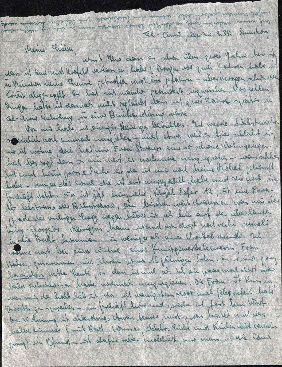 wisst Ihr, dass es schon über zwei Jahre her ist, dass ich Euch und Krefeld verlassen habe? Morgen vor zwei Jahren habe ich in München meine Chewre getroffen und bin gefahren - übermorgen schon von Triest abgesegelt. Es hat sich manches geändert inzwischen. Vor allen Dingen hätte ich damals nicht geglaubt, dass ich zwei Jahre später in Tel-Aviv Lehrling in einer Buchhandlung wäre.