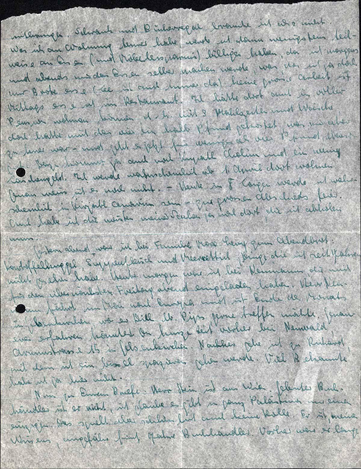Gestern abend war ich bei Familie Max Levy zum Abendbrot: Kartoffelkuggel, Suppenfleisch und Meerrettich; Dinge, die ich seit Jahren nicht gesehen habe. Heute morgen war ich bei Neumanns, die mich für den übernächsten Freitag abend eingeladen haben. Her Neumann fährt im Mai nach Europa und ist Ende des Monats in Gelsenkirchen, wo er Dich, lb. Pips, gerne treffen möchte. Genaueres erfahren könntest Du kurze Zeit vorher bei Neuwald, [..]strasse 15 in Gelsenkirchen. Nachher gehe ich zu Richard, mit dem ich ein bissel spazieren gehen werde. Viel Bekannte habe ich ja hier nicht.