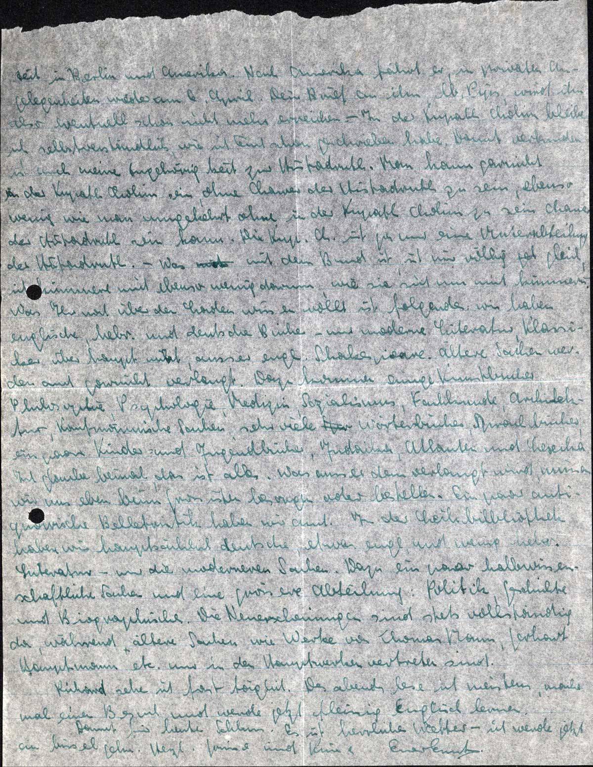 Zeit in Berlin und Amerika. Nach Amerika fährt er, in privaten Angelegenheiten wieder am 6. April. Dein Brief an ihn, lb. Pips, wird ihn also eventuell schon nicht mehr erreichen. - In der Kupath Cholim bleibe ich selbstverständlich, wie ich Euch schon geschrieben habe. Damit verbunden ist auch meine Zugehörigkeit zur Histadruth. Man kann gar nicht in der Kupath Cholim sein, ohne Chawer der Histadruth zu sein, ebenso wenig wie man umgekehrt ohne in der Kupath Cholim zu sein Chawer der Histadruth sein kann. Die Kup. Ch. ist ja nur eine Unterabteilung der Histadruth. - Was mit dem Bund ist, ist mir völlig gleich, ich kümmere mich ebenso wenig darum, wie sie sich um mich kümmern. - Was Ihr noch über den Laden wissen wollt, ist folgendes: wir haben englische, hebr. und deutsche Bücher - nur moderne Literatur, Klassiker überhaupt nicht, ausser engl. Shakespeare. Ältere Sachen werden auch gar nicht verlangt. Dazu kommen einige Kunstbücher, Philosophie, Psychologie, Medizin, Sozialismus, Fachkunde, Architektur, kaufmännische Sachen, sehr viele Wörterbücher, Sprachbücher, ein paar Kinder- und Jugendbücher, Judaica, Atlanten und Lexika. Ich glaube beinah, das ist alles. Was ausserdem verlangt wird, müssen wir uns eben beim Grossisten besorgen oder bestellen. Ein paar antiquarische Belletristik haben wir auch. In der Leihbibliothek haben wir hauptsächlich deutsche, etwas engl. und wenig hebr. Literatur - nur die moderneren Sachen. Dazu ein paar halbwissenschaftliche Sachen und eine grössere Abteilung: Politik, Geschichte und Biographisches. Die Neuerscheinungen sind stets vollständig da, während ältere Sachen wie Werke von Thomas Mann, Gerhart Hauptmann etc. nur in den Hauptwerken vertreten sind.