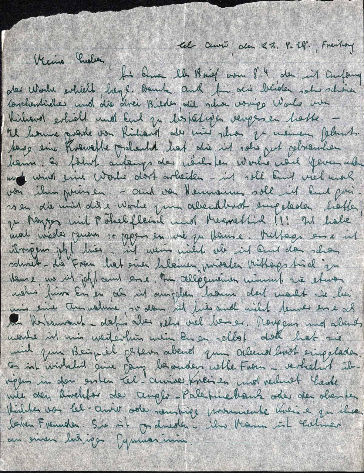 für Euren lb. Brief vom 8.4., den ich Anfang der Woche erhielt, herzl. Dank. Auch für die beiden sehr schönen Taschentücher und die drei Bilder, die schon vorige Woche von Richard erhielt und Euch zu bestätigen vergessen hatte. - Ich komme gerade von Richard, der mir schon zu meinem Geburtstage eine Krawatte geschenkt hat, die ich sehr gut gebrauchen kann. Er fährt anfangs der nächsten Woche nach Jerusalem und wird eine Woche dort arbeiten - ich soll Euch vielmals von ihm grüssen. - Auch von Neumanns soll ich Euch grüssen, die mich diese Woche zum Abendbrot eingeladen hatten, zu Mazzes mit Pökelfleisch und Meerrettich!!! Ich habe mal wieder genau so gegessen wie zu Hause. Mittags esse ich übrigens jetzt hier - ich weiss nicht ob ich Euch das schon schrieb - die Frau hat einen kleinen „privaten Mittagstisch” zu Hause, wo ich jetzt auch esse. Im Allgemeinen nimmt sie etwas mehr fürs Essen, als ich ausgeben kann, doch macht sie bei mir eine Ausnahme, so dass ich hier auch nicht teurer esse als im Restaurant - dafür aber sehr viel besser. Morgens und abends mache ich mir weiterhin mein Essen selbst, doch hat sie mich zum Beispiel gestern abend zum Abendbrot eingeladen. Es ist wirklich eine ganz besonders nette Frau - verkehrt übrigens in den ersten Tel-Aviver Kreisen und rechnet Leute wie den Direktor der Anglo-Palestinebank oder den obersten Richter von Tel-Aviv oder sonstige prominente Kreise zu ihren besten Freunden. Sie ist geschieden - ihr Mann ist Lehrer an einem hiesigen Gymnasium.