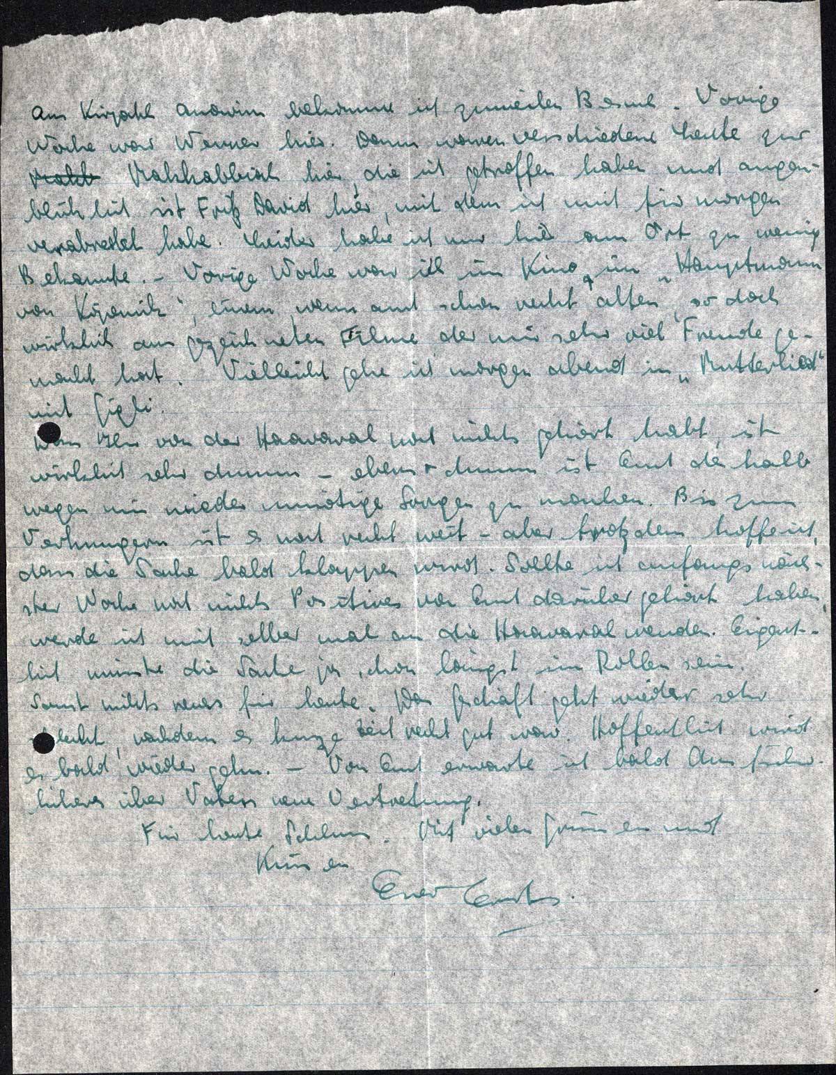 Aus Kirjath Anavim bekomme ich zuweilen Besuch. Vorige Woche war Werner hier. Dann waren verschiedene Leute zur Makkabbiah hier, die ich getroffen haben und augenblicklich ist Fritz David hier, mit dem ich mich für morgen verabredet habe. Leider habe ich nur hier am Ort zu wenig Bekannte. - Vorige Woche war ich im Kino im „Hauptmann von Köpenick”, einem, wenn auch schon recht alten, so doch wirklich ausgezeichneten Filme, der mir sehr viel Freude gemacht hat. Vielleicht gehe ich morgen abend in „Mutterlied” mit Gigli.