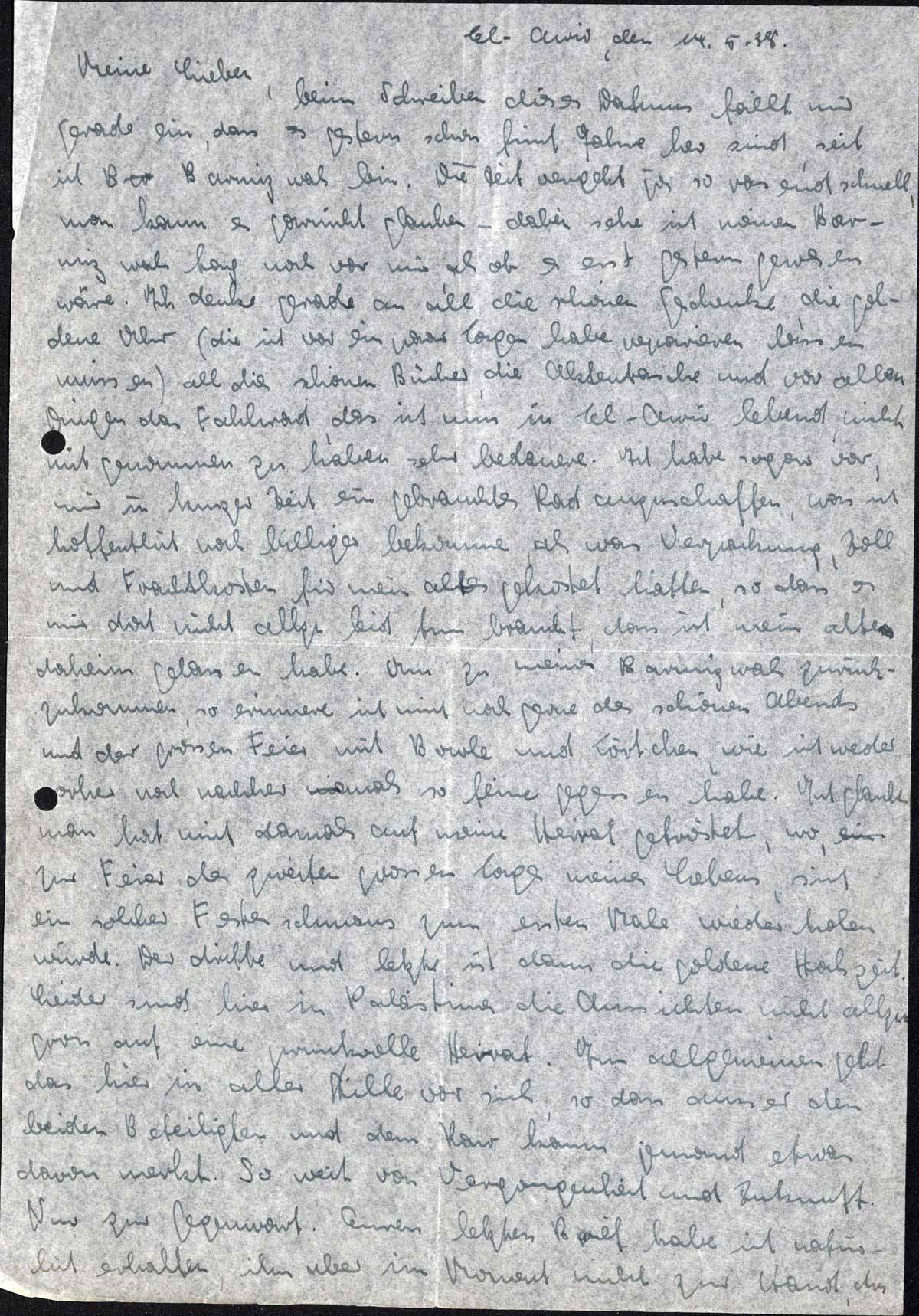 beim Schreiben dieses Datums fällt mir gerade ein, dass es gestern schon fünf Jahre her sind, seit ich Barmiz wah bin. Die Zeit vergeht ja so rasend schnell, man kann es garnicht glauben - dabei sehe ich meinen Barmiz wah-Tag noch vor mir, als ob es erst gestern gewesen wäre. Ich denke gerade an all die schönen Geschenke, die goldene Uhr (die ich vor ein paar Tagen habe reparieren lassen müssen) all die schönen Bücher, die Aktentasche und vor allen Dingen das Fahrrad, das ich nun in Tel-Aviv lebend, nicht mitgenommen zu haben sehr bedauere. Ich habe sogar vor, mir in kurzer Zeit ein gebrauchtes Rad anzuschaffen, was ich hoffentlich noch billiger bekomme, als was Verpackung, Zoll und Frachtkosten für mein altes gekostet hätten, so dass es mir doch nicht allzu leid tun braucht, dass ich mein altes daheim gelassen habe. Um zu meiner Barmiz wah zurückzukommen, so erinnere ich mich noch gerne des schönen Abends und der grossen Feier mit Bowle und Törtchen, wie ich weder vorher noch nachher niemals so feine gegessen habe. Ich glaube, man hat mich damals auf meine Heirat getröstet, wo, zur Feier des zweiten grossen Tages meines Lebens, sich ein solcher Festenschmaus zum ersten Male wiederholen würde. Der dritte und letzte ist dann die goldene Hochzeit. Leider sind hier in Palästina die Aussichten nicht allzu gross auf eine prunkvolle Heirat. Im allgemeinen feht das hier in aller Stille vor sich, so dass ausser den beiden Beteiligten und dem Paar kaum jemand etwas davon merkt. So weit von Vergangenheit und Zukunft. Nun zur Gegenwart. Euren letzten Brief habe ich natürlich erhalten, ihn aber im Moment nicht zur Hand, da