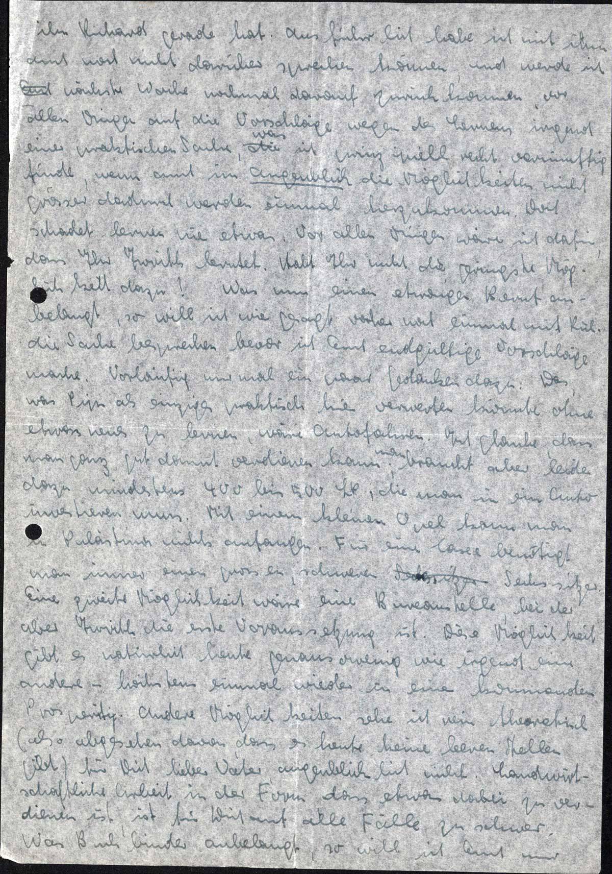ihn Richard gerade hat. Ausführlich habe ich mit ihm auch noch nicht darüber sprechen können, und werde ich nächste Woche nochmal darauf zurückkommen, vor allen Dingen auf die Vorschläge wegen des Lernens irgend einer praktischen Sache, was ich prinzipiell recht vernünftig finde, wenn auch im Augenblick die Möglichkeiten nicht grösser dadurch werden, einmal herzukommen. Doch schadet lernen nie etwas. Vor allen Dingen wäre ich dafür, dass Ihr Iwrith lerntet. Habt Ihr nicht die geringste Möglichkeit dazu? Was nun einen etwaigen Beruf anbelangt, so will ich, wie gesagt, vorher noch einmal mit Richard die Sache besprechen, bevor ich Euch endgültige Vorschläge mache. Vorläufig nur mal ein paar Gedanken dazu: Das, was Pips als einziges praktische hier verwerten könnte ohne etwas neues zu lernen, wäre Autofahren. Ich glaube, dass man ganz gut damit verdienen kann. Man braucht aber leider dazu mindestens 400 bis 500 ₤P, die man in ein Auto investieren muss. Mit einem kleinen Opel kann man in Palästina nichts anfangen. Für eine Taxe benötigt man immer einen grossen, schweren Sechssitzer. Eine zweite Möglichkeit wäre eine Bureaustelle, bei der aber Iwrith die erste Voraussetzung ist. Diese Möglichkeit gibt es natürlich heute genausowenig wie irgend eine andere - höchstens einmal wieder in einer kommenden Prosperity. Andere Möglichkeiten sehe ich rein theoretisch (also abgesehen davon, dass es heute keine leeren Stellen gibt) für Dich, lieber Vater, augenblicklich nicht. Landwirtschaftliche Arbeit in der Form, dass etwas dabei zu verdienen ist, ist für Dich auf alle Fälle zu schwer.