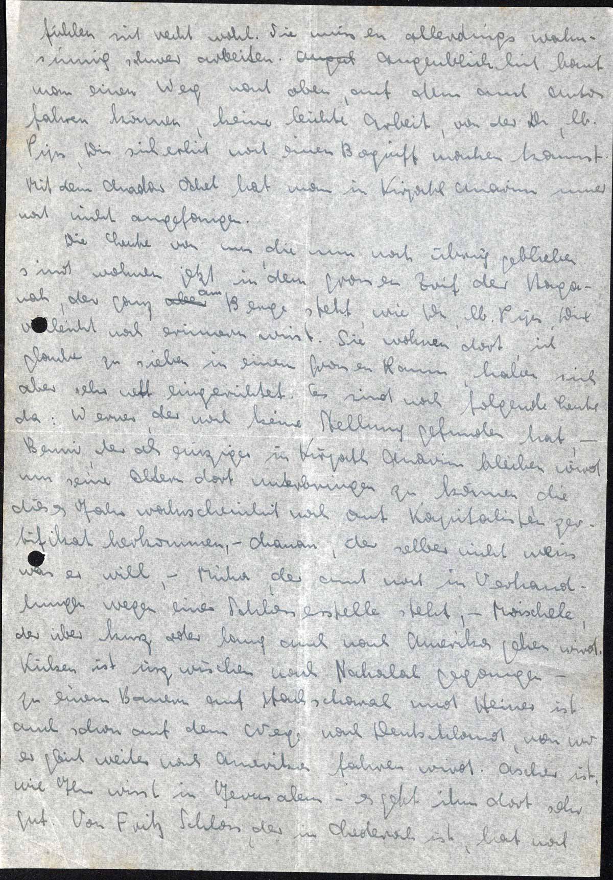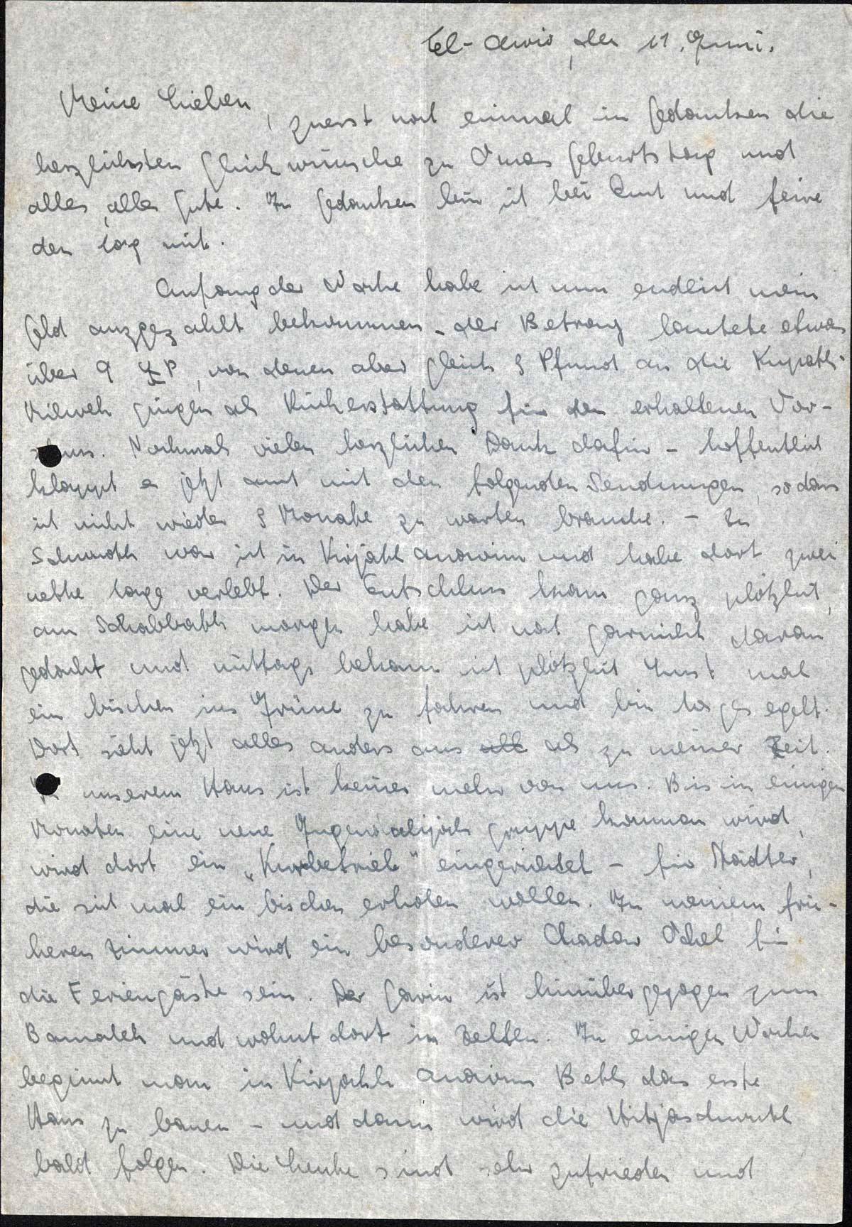 Die Leute von uns, die nun noch übrig geblieben sind wohnen jetzt in dem grossen Zvif der Haganah, der ganz am Berge steht wie Du, lb. Pips, Dich vielleicht noch erinnern wirst. Sie wohnen dort, ich glaube zu sieben in einem grossen Raum, haben sich aber sehr nett eingerichtet. Es sind noch folgende Leute da: Werner, der noch keine Stellung gefunden hat, - Benni, der als einziger in Kirjath Anavim bleiben wird um seine Eltern dort unterbringen zu können, die dieses Jahr wahrscheinlich noch auf Kapitalistenzertifikat herkommen, - Chanan, der selber nicht weiss was er will, - Micha, der auch noch in Verhandlungen wegen einer Schlosserstelle steht, - Moischele, der über kurz oder lang auch nach Amerika gehen wird. Küken ist inzwischen nach Nahalah gegangen - zu einem Bauern auf Hachscharah und Heiner ist auch schon auf dem Wege nach Deutschland, von wo er gleich weiter nach Amerika fahren wird. Ascher ist, wie Ihr wisst in Jerusalem - es geht ihm dort sehr gut. Von Fritz Schloss, der in Chederah ist, hat noch