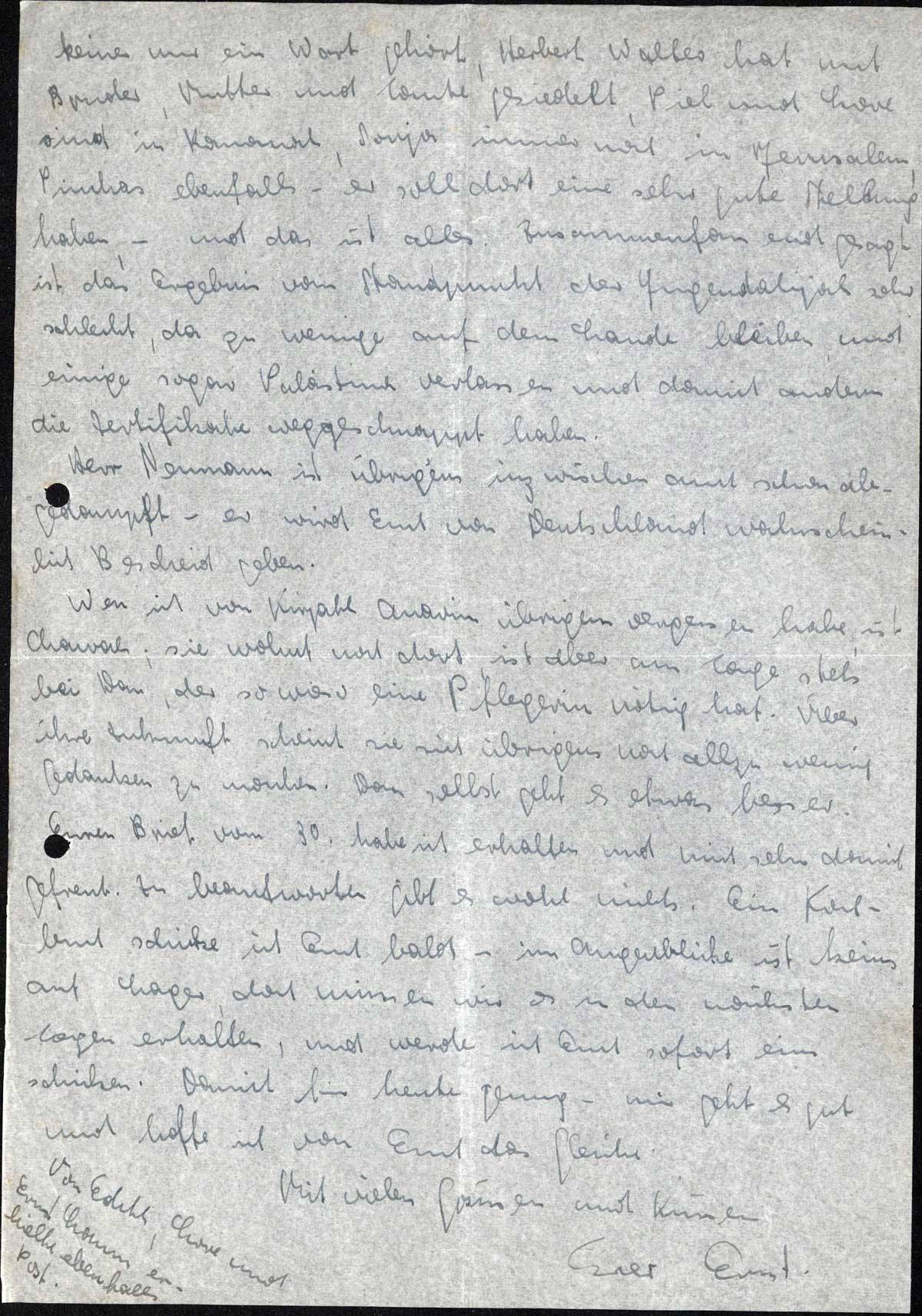 keiner nur ein Wort gehört, Herbert Walter hat mit Bruder, Mutter und Tante gesiedelt, Piel und Lore sind Rananah, Sonja immer noch in Jerusalem, Pinchas ebenfalls - er soll dort eine sehr gute Stellung haben, - und das ist alles. Zusammenfassend gesagt ist das Ergebnis vom Standpunkt der Jugendalijah sehr schlecht, da zu wenige auf dem Lande bleiben, und einige sogar Palästina verlassen und damit andern die Zertifikate weggeschnappt haben.