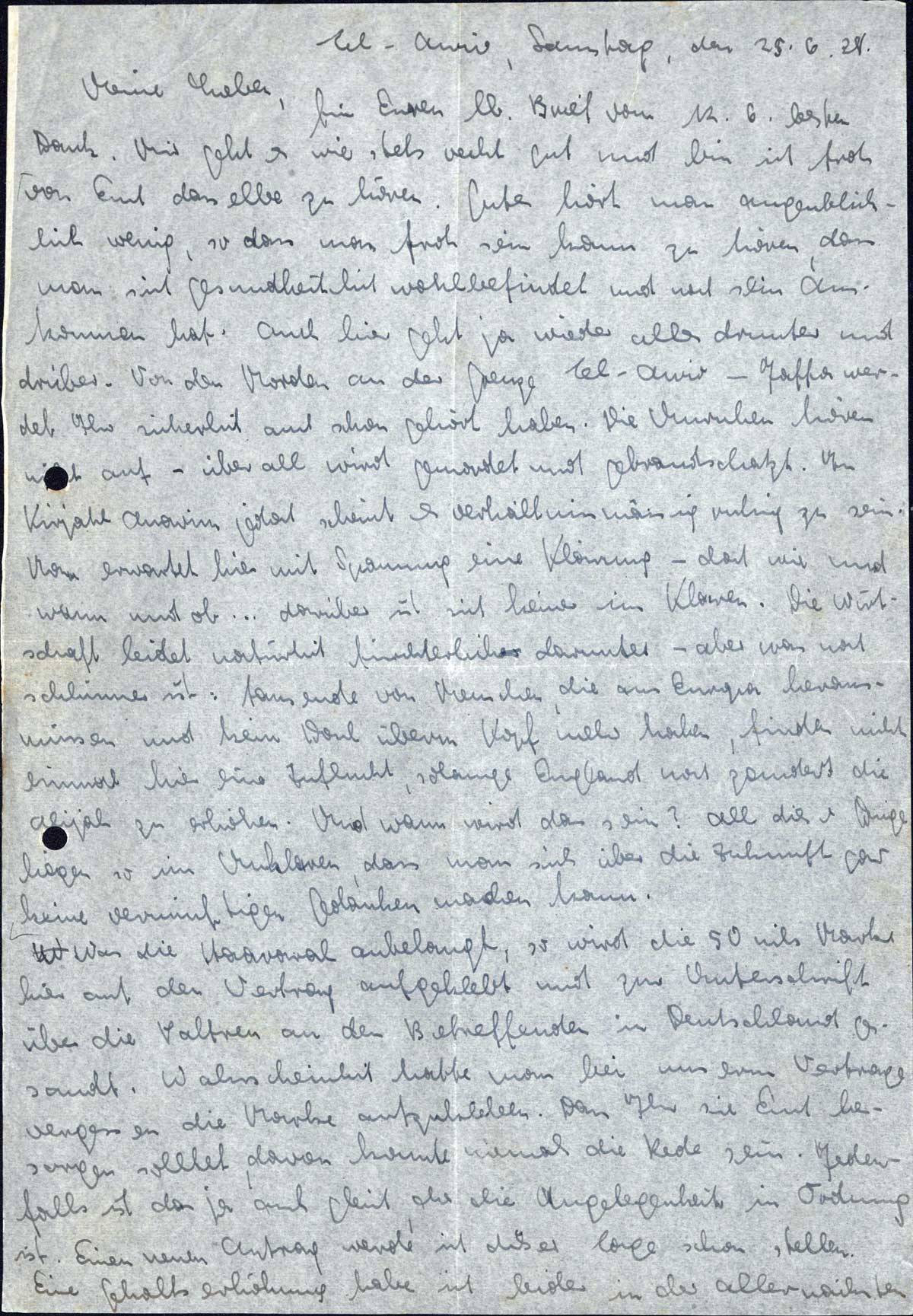 für Euren lb. Brief vom 12. 6. besten Dank. Mir geht es wie stets recht gut und bin ich froh, von Euch dasselbe zu hören. Gutes hört man augenblicklich wenig, so dass man froh sein kann zu hören, dass man sich gesundheitlich wohl befindet und noch sein Auskommen hat. Auch hier geht ja wieder alles drunter und drüber. Von den Morden an der Grenze Tel-Aviv - Jaffa werdet Ihr sicherlich auch schon gehört haben. Die Unruhen hören nicht auf - überall wird gemordet und gebrandschatzt. In Kirjath Anavim jedoch scheint es verhältnismässig ruhig zu sein. Man erwartet hier mit Spannung eine Klärung - doch wie und wann und ob ... darüber ist sich keiner im Klaren. Die Wirtschaft leidet natürlich fürchterlich darunter - aber was noch schlimmer ist: Tausende von Menschen, die aus Europa heraus müssen und kein Dach überm Kopf mehr haben, finden nicht einmal hier eine Zuflucht, solange England noch zaudert die Alijah zu erhöhen. Und wann wird das sein? All diese Dinge liegen so im Unklaren, dass man sich über die Zukunft gar keine vernünftigen Gedanken machen kann.