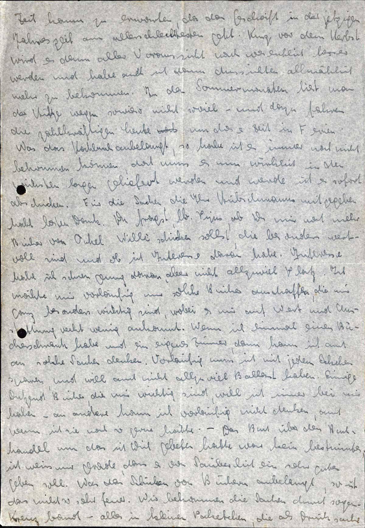 Was das Kochbuch anbelangt, so habe ich es immer noch nicht bekommen können, doch muss es nun wirklich in den nächsten Tagen geliefert werden und werde ich es sofort abschicken. Für die Sachen, die Ihr Hübschmanns mitgegeben habt besten Dank. Du fragst, lb. Pips, ob Du mir noch mehr Bücher von Onkel Willi schicken sollst, die besonders wertvoll sind und ob ich Interesse daran habe. Interesse habe ich schon genug daran, aber nicht allzuviel Platz. Ich möchte mir vorläufig nur solche Bücher anschaffen, die mir ganz besonders wichtig sind, wobei es mir auf Wert und Ausstattung recht wenig ankommt. Wenn ich einmal einen Bücherschrank habe und ein eigenes Zimmer, dann kann ich auch an solche Sachen denken. Vorläufig muss ich mit jedem Eckchen sparen, und will auch nicht allzu viel Ballast haben. Einige Dutzend Bücher, die mir wichtig sind, will ich immer bei mir haben - an andere kanne ich vorläufig nicht denken, auch wenn ich sie noch so gerne hätte. - Das Buch über den Buchhandel um das ich Dich gebeten hatte war kein bestimmtes, ich weiss nur gerade, dass es von Säuberlich ein sehr gutes geben soll. Was das Schicken von Büchern anbelangt, so ist das nicht so sehr teuer. Wir bekommen die Sachen durch sogen. Kreuzband - alles in kleinen Paketchen, die als Drucksache