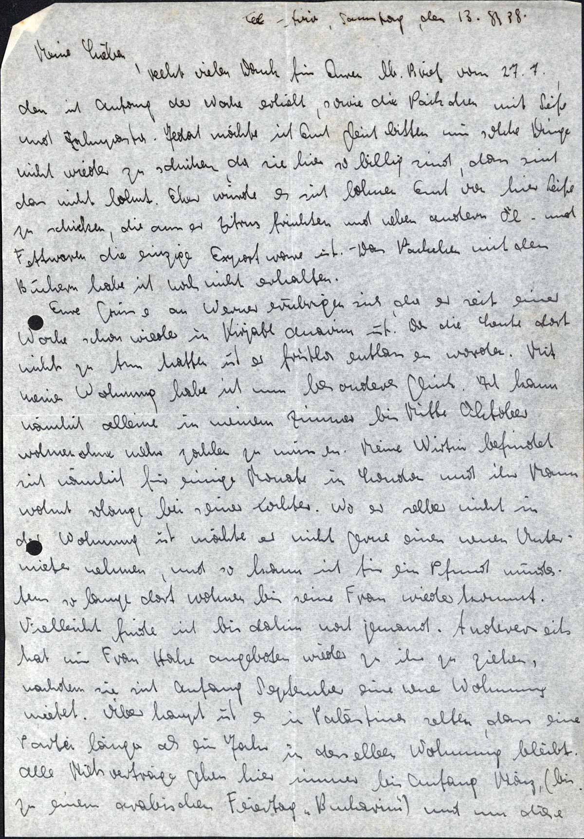 Eure Grüsse an Werner erübrigen sich,da er seit einer Woche schon wieder in Kirjath Anavim ist. Da die Leute dort nichts zu tun hatten, ist er fristlos entlassen worden. Mit meiner Wohnung habe ich nun besonderes Glück. Ich kann nämlich alleine in meinem Zimmer bis Mitte Oktober wohnen ohne mehr zahlen zu müssen. Meine Wirtin befindet sich nämlich für einige Monate in London und ihr Mann wohnt solange bei seiner Tochter. Wo er selber nicht in der Wohnung ist möchte er nicht gerne einen neuen Untermieter nehmen, und so kann ich für ein Pfund mindestens so lange dort wohnen bis seine Frau wiederkommt. Vielleicht finde ich bis dahin noch jemand. Andererseits hat mir Frau Hake angeboten wieder zu ihr zu ziehen, nachdem sie seit Anfang September eine neue Wohnung mietet. Überhaupt ist es in Palästina selten, dass eine Partei länger als ein Jahr in derselben Wohnung bleibt. Alle Mietverträge gehen hier immer bis Anfang März, (bis zu einem arabischen Feiertag „Puharim”) und um diese