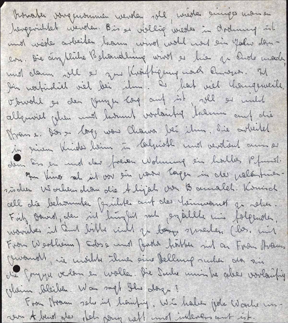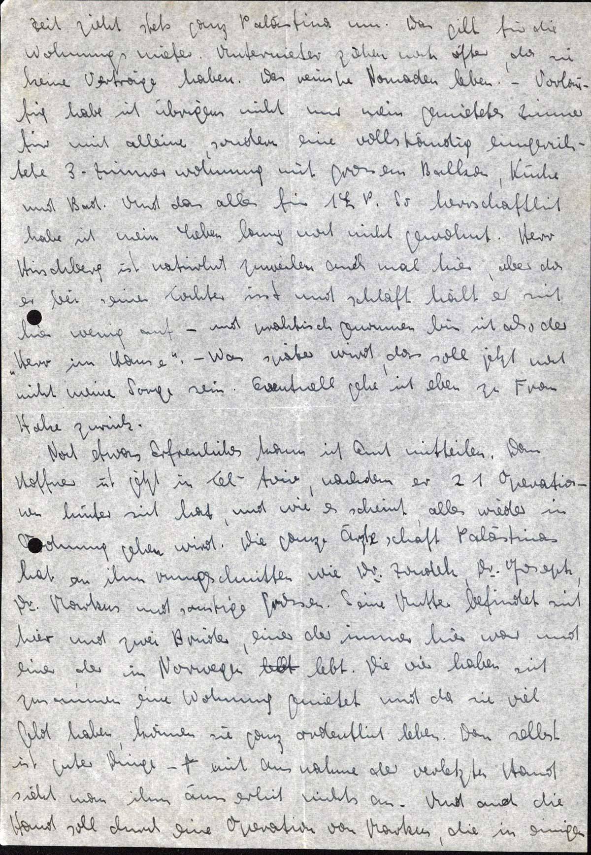 Noch etwas Erfreuliches kann ich Euch mitteilen. Dan Hoffner ist jetzt in Tel-Aviv, nachdem er 21 Operationen hinter sich hat und, wie es scheint, alles wieder in Ordnung gehen wird. Die ganze Ärzteschaft Palästinas hat an ihm rumgeschnitten wie Dr. Zondek, Dr. Joseph, Dr. Markus und sonstige Grössen. Seine Mutter befindet sich hier und zwei Brüder, einer der immer hier war und einer der in Norwegen lebt. Die vier haben sich zusammen eine Wohnung gemietet und da sie viel Geld haben, können sie ganz ordentlich leben. Dan selbst ist guter Dinge - mit Ausnahme der verletzten Hand sieht man ihm äusserlich nichts an. Und auch die Hand soll durch eine Operation von Markus, die in einigen