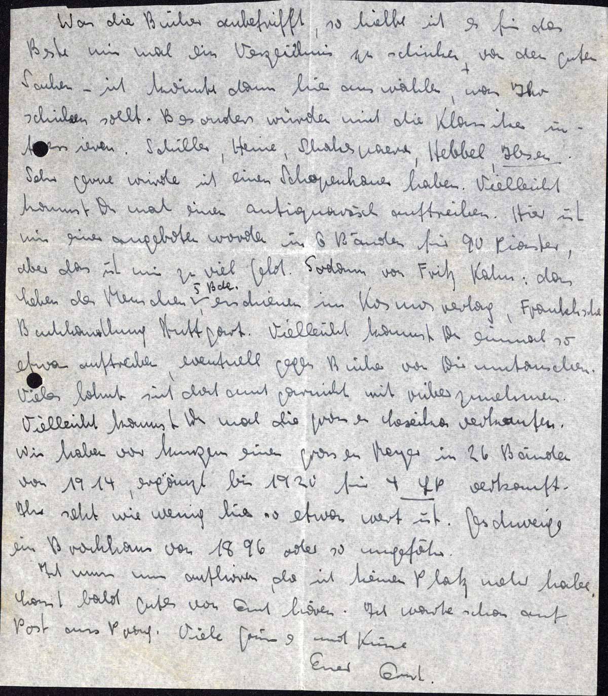 Was die Bücher anbetrifft, so halte ich es für das Beste mir mal ein Verzeichnis zu schicken von den guten Sachen - ich könnte dann hier auswählen, was Ihr schicken sollt. Besonders würden mich die Klassiker interessieren. Schiller, Heine, Shakespeare, Hebbel, Ibsen. Sehr gerne würde ich einen Schopenhauer haben. Vielleicht kannst Du mal einen antiquarisch auftreiben. Hier ist mir einer angeboten worden in 6 Bänden für 90 Piaster, aber das ist mir zu viel Geld. Sodann von Fritz Kahn: Das Leben des Menschen, 5 Bde., erschienen im Kosmosverlag, Frankhsche Buchhandlung Stuttgart. Vielleicht kannst Du einmal so etwas auftreiben, eventuell gegen Bücher von Dir umtauschen. Vieles lohnt sich doch auch garnicht mit rüberzunehmen. Vielleicht kannst Du mal die grossen Lexika verkaufen. Wir haben vor kurzem einen grossen Meyer in 26 Bänden von 1914, ergänzt bis 1920 für 4 ₤P verkauft. Ihr sehr wie wenig hier so etwas wert ist. Geschweige ein Brockhaus von 1896 oder so ungefähr.