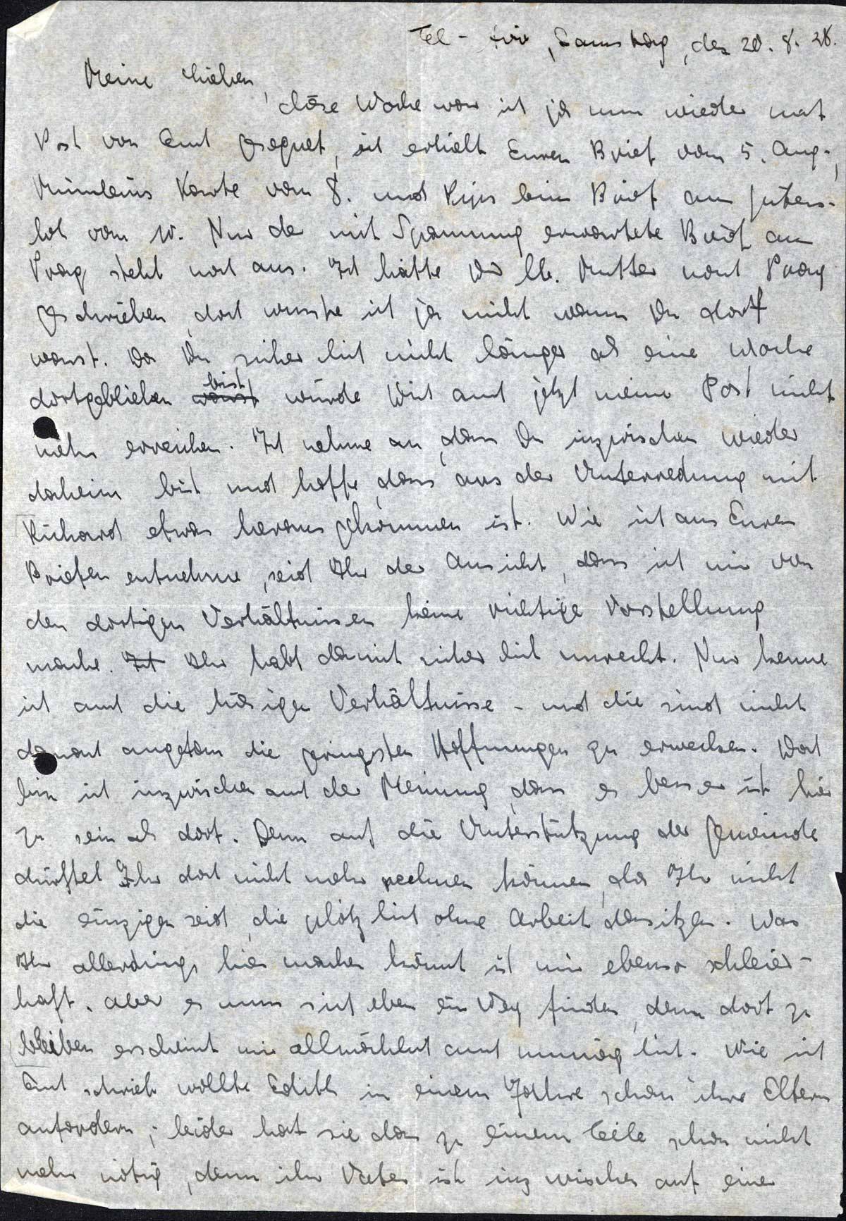 diese Woche war ich ja nun wieder mit Post von Euch gesegnet, ich erhielt Euren Brief vom 5. Aug., Mümleins Karte vom 8. und Pipsleins Brief aus Gütersloh vom 10. Nur der mit Spannung erwartete Brief aus Prag steht noch aus. Ich hätte Dir lb. Mutter nach Prag geschrieben, doch wusste ich ja nicht wann Du dort warst. Da Du sicherlich nicht länger als eine Woche dortgeblieben bist, würde Dich auch jetzt meine Post nicht mehr erreichen. Ich nehme an, dass Du inzwischen wieder daheim bist und hoffe, dass aus der Unterredung mit Richard etwas herausgekommen ist. Wie ich aus Euren Briefen entnehme, seid Ihr der Ansicht, dass ich mir von den dortigen Verhältnissen keine richtige Vorstellung mache. Ihr habt damit sicherlich unrecht. Nur kenne ich auch die hiesigen Verhältnisse - und die sind nicht danach angetan die geringsten Hoffnungen zu erwecken. Doch bin ich inzwischen auch der Meinung, dass es besser ist hier zu sein als dort. Denn auf die Unterstützung der Gemeinde dürftet Ihr doch nicht mehr rechnen können, da Ihr nicht die einzigen seid, die plötzlich ohne Arbeit dasitzen. Was Ihr allerdings hier machen könnt, ist mir ebenso schleierhaft. Aber es muss sich eben ein Weg finden, denn dort zu bleiben, erscheint mir allmählich auch unmöglich. Wie ich Euch schrieb, wollte Edith in einem Jahre schon Ihre Eltern anfordern; leider hat sie das zu einem Teile schon nicht mehr nötig, denn ihr Vater ist inzwischen auf einer