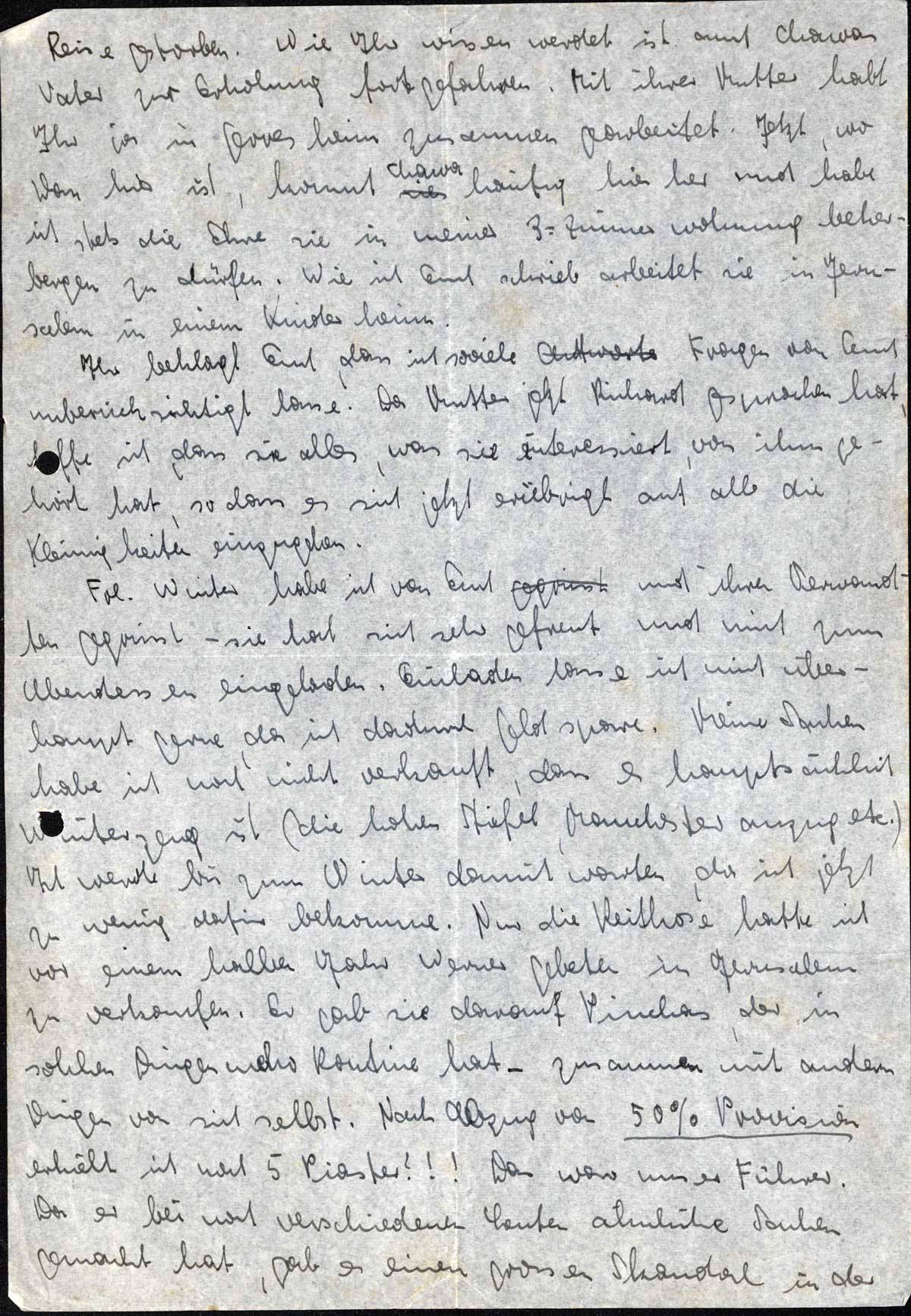 Was die Haavarah anbetrifft, so schickt mir weiterhin nur 60 RM und keine 75. Für die 15 RM bekomme ich nur 80 Piaster, und es geht auch ohnedem. Was für die Zukunft sein wird, das weiss ich auch nicht. Von der Jugendalijah kann ich keinesfalls noch etwas bekommen. Ich hoffe, Ende des Jahres 2 Pfund zu verdienen; eventuell muß Richard einspringen. Ich kann vorläufig in dieser Hinsicht nichts unternehmen - will auch erst abwarten bis Richard hier ist und ich von ihm alles ausführlich hören kann. -