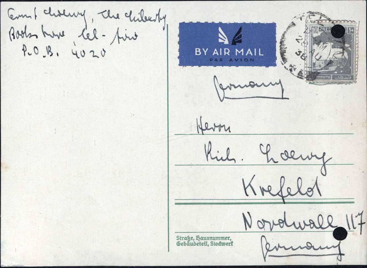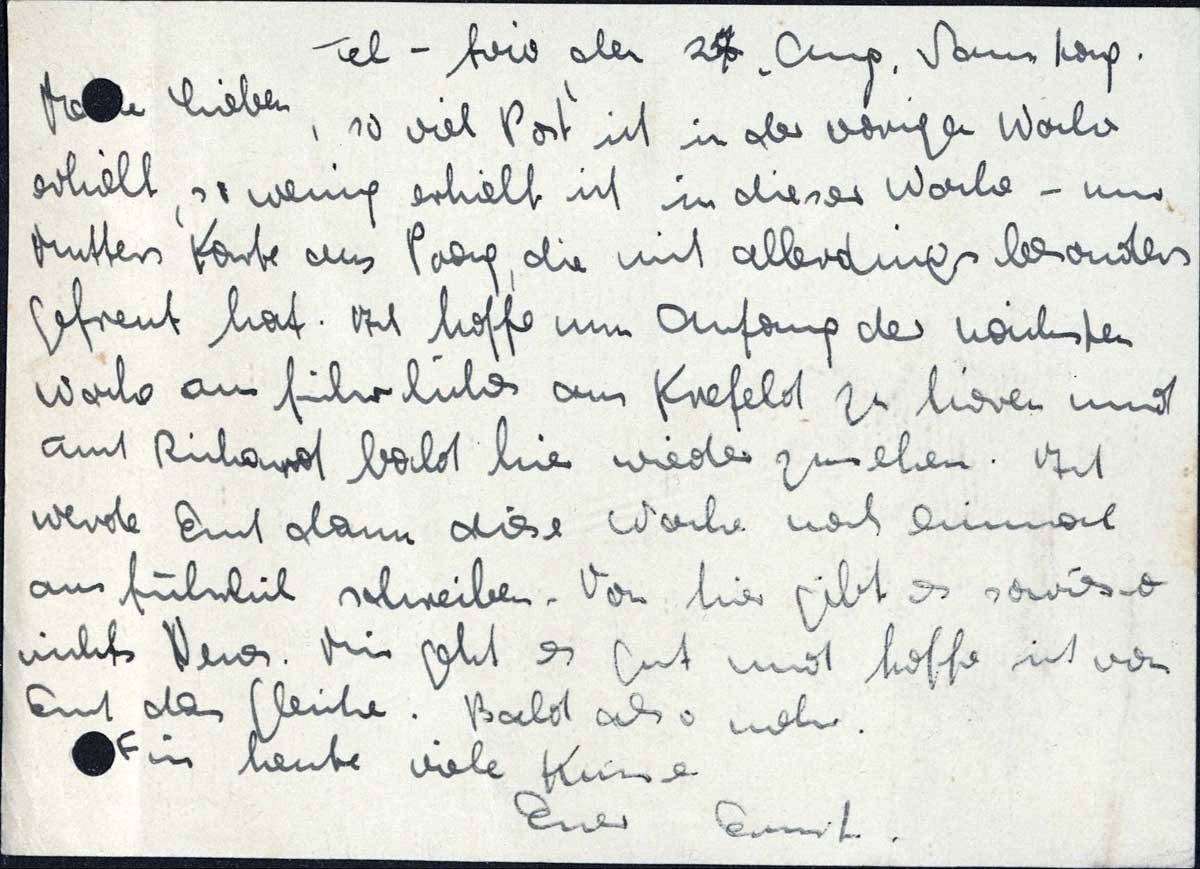 so viel Post ich in der vorigen Woche erhielt, so wenig erhielt ich in dieser Woche - nur Mutters Karte aus Prag, die mich allerdings besonders gefreut hat. Ich hoffe nun Anfang der nächsten Woche ausführliches aus Krefeld zu hören und auch Richard bald hier wiederzusehen. Ich werde Euch dann diese Woche noch einmal ausführlich schreiben. Von hier gibt es sowieso nichts Neues. Mir geht es gut und hoffe ich von Euch das Gleiche. Bald also mehr.