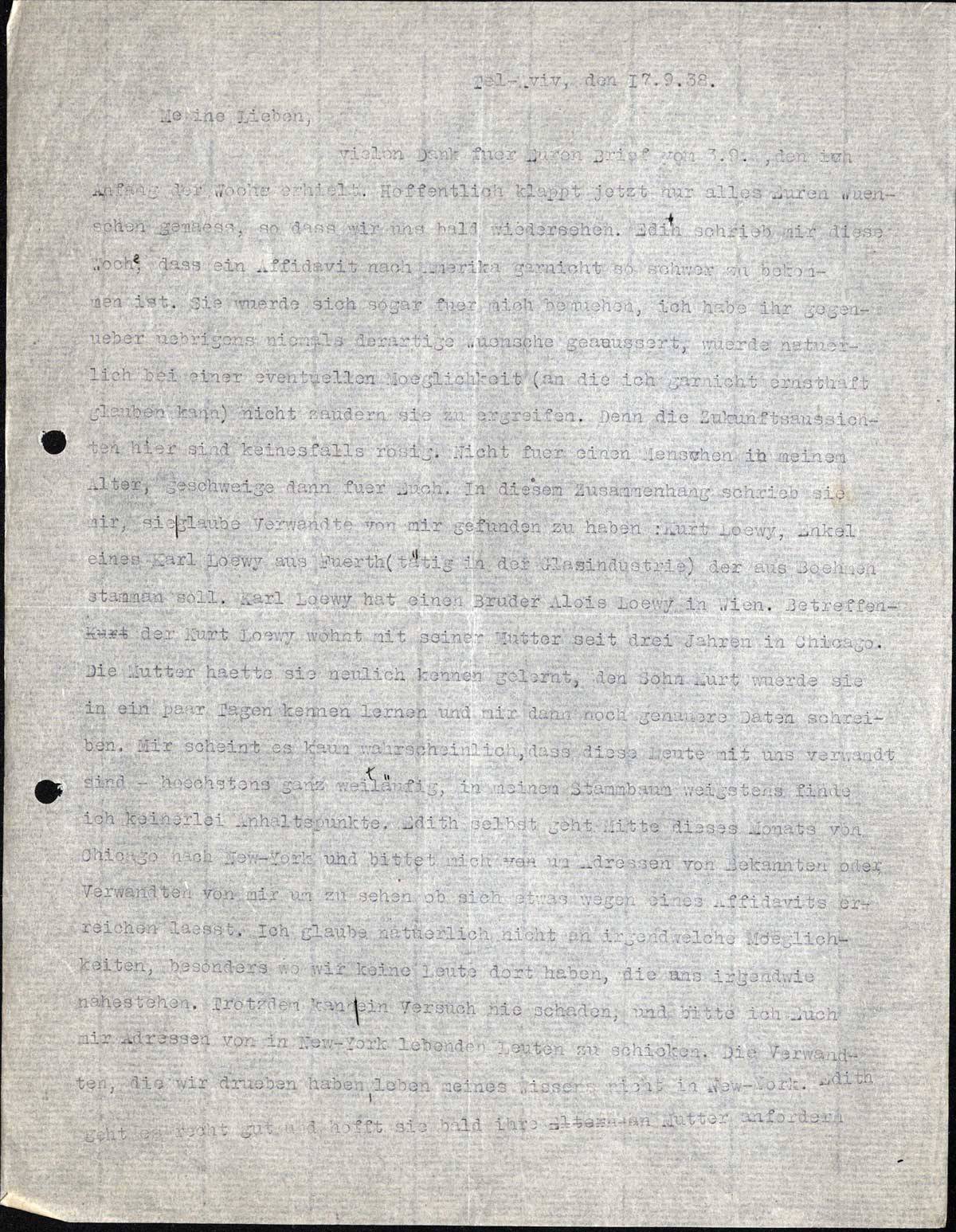 vielen Dank fuer Euren Brief vom 3. 9., den ich Anfang der Woche erhielt. Hoffentlich klappt jetzt nur alles Euren Wuenschen gemaess, so dass wir uns bald wiedersehen. Edith schrieb mir diese Woche, dass ein Affidavit nach Amerika garnicht so schwer zu bekommen ist. Sie wuerde sich sogar fuer mich bemuehen, ich habe ihr gegenueber uebrigens niemals derartige Wuensche geaeussert, wuerde natuerlich bei einer eventuellen Moeglichkeit (an die ich garnicht ernsthaft glauben kann) nicht zaudern sie zu ergreifen. Denn die Zukunftsaussichten hier sind keinesfalls rosig. Nicht fuer einen Menschen in meinem Alter, geschweige denn fuer Euch. In diesem Zusammenhang schrieb sie mir, sie glaube Verwandte von mir gefunden zu haben: Kurt Loewy, Enkel eines Karl Loewy aus Fuerth (taetig in der Glasindustrie) der aus Boehmen stammen soll. Karl Loewy hat einen Bruder Alois Loewy in Wien. Betreffender Kurt Loewy wohnt mit seiner Mutter seit drei Jahren in Chicago. Die Mutter haette sie neulich kennen gelernt, den Sohn Kurt wuerde sie in ein paar Tagen kennen lernen und mir dann noch genauere Daten schreiben. Mir scheint es kaum wahrscheinlich, dass diese Leute mit uns verwandt sind - hoechstens ganz weitläufig, in meinem Stammbaum wenigstens finde ich keinerlei Anhaltspunkte. Edith selbst geht Mitte dieses Monats von Chicago nach New York und bittet mich um Adressen von Bekannten oder Verwandten von mir um zu sehen, ob sich etwas wegen eines Affidavits erreichen laesst. Ich glaube natuerlich nicht an irgendwelche Moeglichkeiten, besonders wo wir keine Leute dort haben, die uns irgendwie nahestehen. Trotzdem kann ein Versuch nie schaden, und bitte ich Euch mir Adressen von in New York lebenden Leuten zu schicken. Die Verwandten, die wir drueben haben, leben meines Wissens nicht in New York. Edith geht es sehr gut und hofft sie bald ihre Mutter anfordern