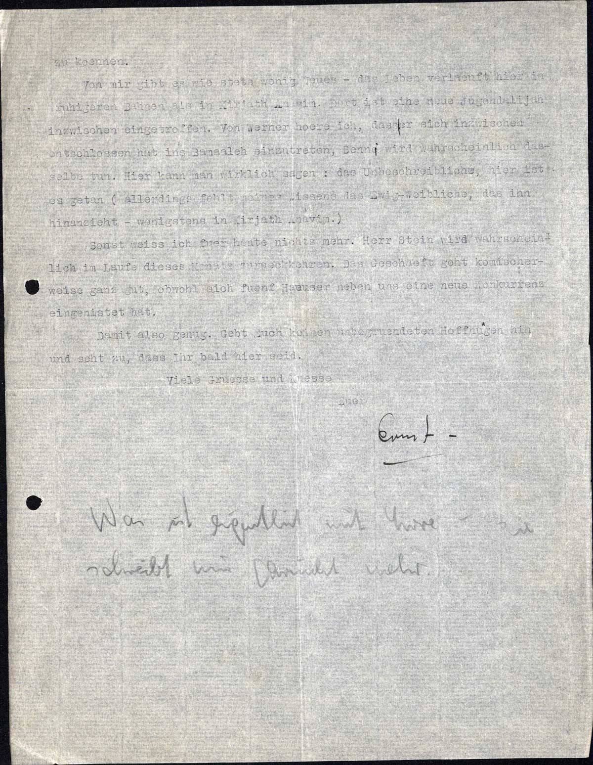 Von mir gibt es wie stets wenig Neues - das Leben verlaeuft hier in ruhigeren Bahnen als in Kirjath Anavim. Dort ist eine neue Jugendalijah inzwischen eingetroffen. Von Werner hoere ich, dass er sich inzwischen entschlossen hat ins Bamaaleh einzutreten, Benni wird wahrscheinlich dasselbe tun. Hier kann man wirklich sagen: das Unbeschreibliche, hier ist es getan (allerdings fehlt meines Wissens das Ewig-Weibliche, das ihn hinanzieht - wenigstens in Kirjath Anavim).