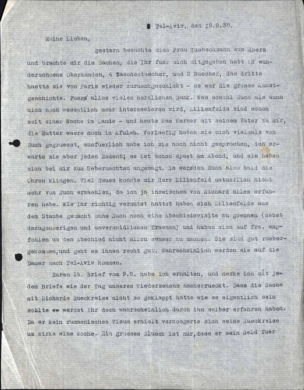 gestern besuchte mich Frau Huebschmann aus Moers und brachte mir die Sachen, die Ihr fuer mich mitgegeben habt: 2 wunderschoene Oberhemden, 4 Taschentuecher, und 2 Buecher, das dritte haette sie von Paris wieder zurueckgeschickt - es war die grosse Kunstgeschichte. Fuer alles vielen herzlichen Dank. Was sowohl Euch als auch mich noch wesentlich mehr interessieren wird, Lilienfelds sind schon seit einer Woche im Lande - und heute kam Werner mit seinem Vater zu mir, die Mutter waere noch in Afuleh. Vorlaeufig haben sie mich vielmals von Euch gegruesst, ausfuehrlich habe ich sie noch nicht gesprochen, ich erwarte sie aber jeden Moment; es ist schon spaet am Abend, und sie haben sich bei mir zum Uebernachten angesagt. Es werden Euch also bald die Ohren klingen. Viel Neues konnte mir Herr Lilienfeld natuerlich nicht mehr von Euch erzaehlen, da ich ja inzwischen von Richard alles erfahren habe. Wie Ihr richtig vermutet hattet, haben sich Lilienfelds aus dem Staube gemacht ohne Euch noch eine Abschiedsvisite zu goennen (nebst dazugehoerigen und unvermeidlichen Traenen) und haben sich auf frz. empfohlen um den Abschied nicht allzu schwer zu machen. Sie sind gut ruebergekommen, und geht es ihnen recht gut. Wahrscheinlich werden sie auf die Dauer nach Tel-Aviv kommen.