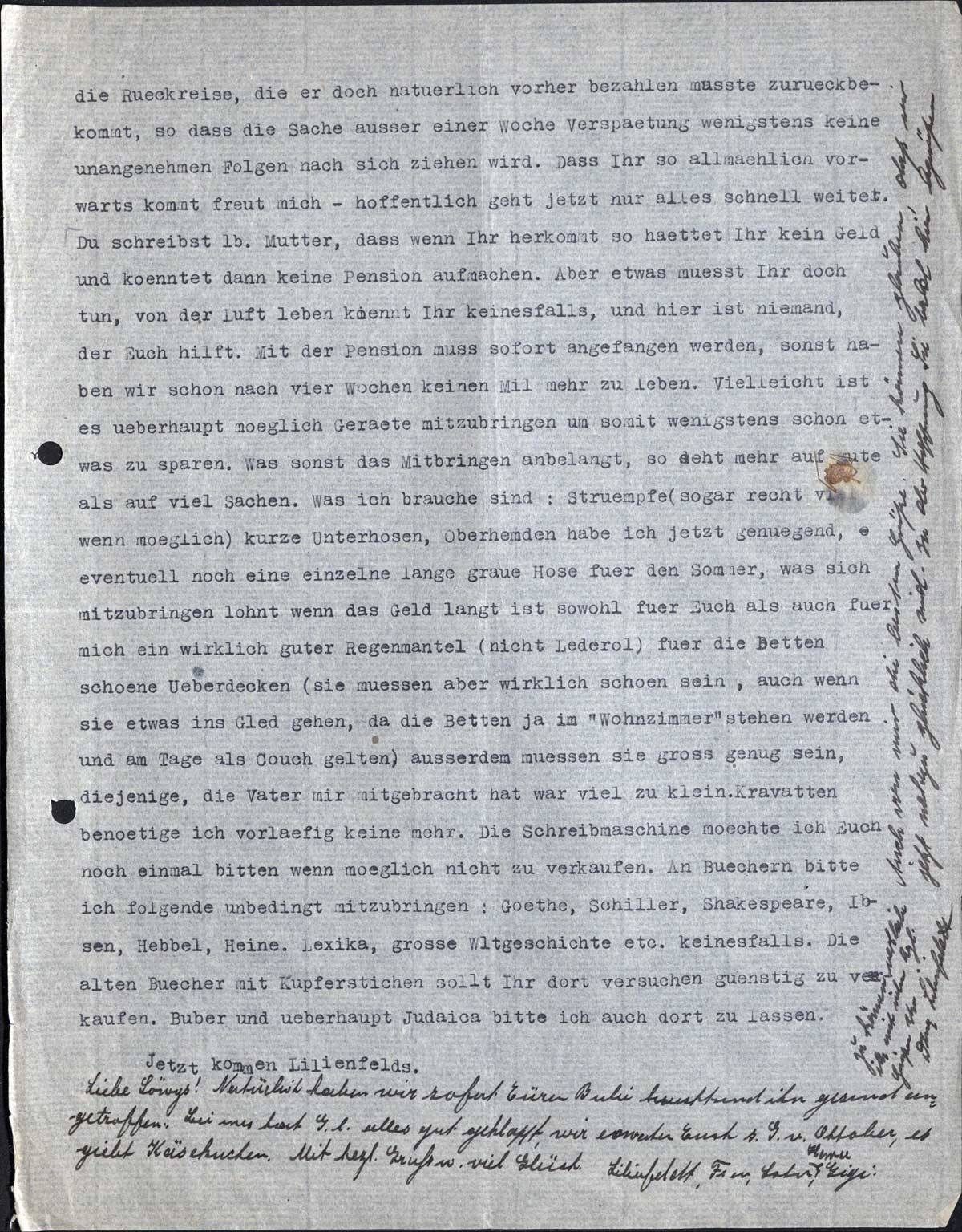 die Rueckreise, die er doch natuerlich vorher bezahlen musste zurueckbekommt, so dass die Sache ausser einer Woche Verspaetung wenigstens keine unangenehmen Folgen nach sich ziehen wird. Dass Ihr so allmählich vorwaerts kommt, freut mich - hoffentlich geht jetzt nur alles schnell weiter. Du schreibst, lb. Mutter, dass wenn Ihr herkommt so haettet Ihr kein Geld und koenntet dann keine Pension aufmachen. Aber etwas muesst Ihr doch tun, von der Luft leben koennt Ihr keinesfalls, und hier ist niemand, der Euch hilft. Mit der Pension muss sofort angefangen werden, sonst haben wir schon nach vier Wochen keinen Mil mehr zu leben. Vielleicht ist es ueberhaupt moeglich Geraete mitzubringen um somit wenigstens schon etwas zu sparen. Was sonst das Mitbringen anbelangt, so seht mehr auf gute als auf viele Sachen. Was sonst das Mitbringen anbelangt, so seht mehr auf gute als auf viele Sachen. Was ich brauche sind: Struempfe (sogar recht viel wenn moeglich) kurze Unterhosen, Oberhemden habe ich jetzt genuegend, eventuell noch eine einzelne lange graue Hose fuer den Sommer, was sich mitzubringen lohnt wenn das Geld langt ist sowohl fuer Euch als auch fuer mich ein wirklich guter Regenmantel (nicht Lederol) fuer die Betten schoene Ueberdecken (sie muessen aber wirklich schoen sein, auch wenn sie etwas ins Geld gehen, da die Betten ja im „Wohnzimmer” stehen werden und am Tage als Couch gelten) ausserdem muessen sie gross genug sein, diejenige, die Vater mir mitgebracht hat war viel zu klein. Kravatten benoetige ich vorlaeufig keine mehr. Die Schreibmaschine moechte ich Euch noch einmal bitten wenn moeglich nicht zu verkaufen. An Buechern bitte ich folgende unbedingt mitzuberingen: Goethe, Schiller, Shakespeare, Ibsen, Hebbel, Heine. Lexika, grosse Weltgeschichte etc. keinesfalls. Die alten Buecher mit Kupferstichen sollte Ihr dort versuchen guenstig zu verkaufen. Buber und ueberhaupt Judaica bitte ich auch dort zu lassen.