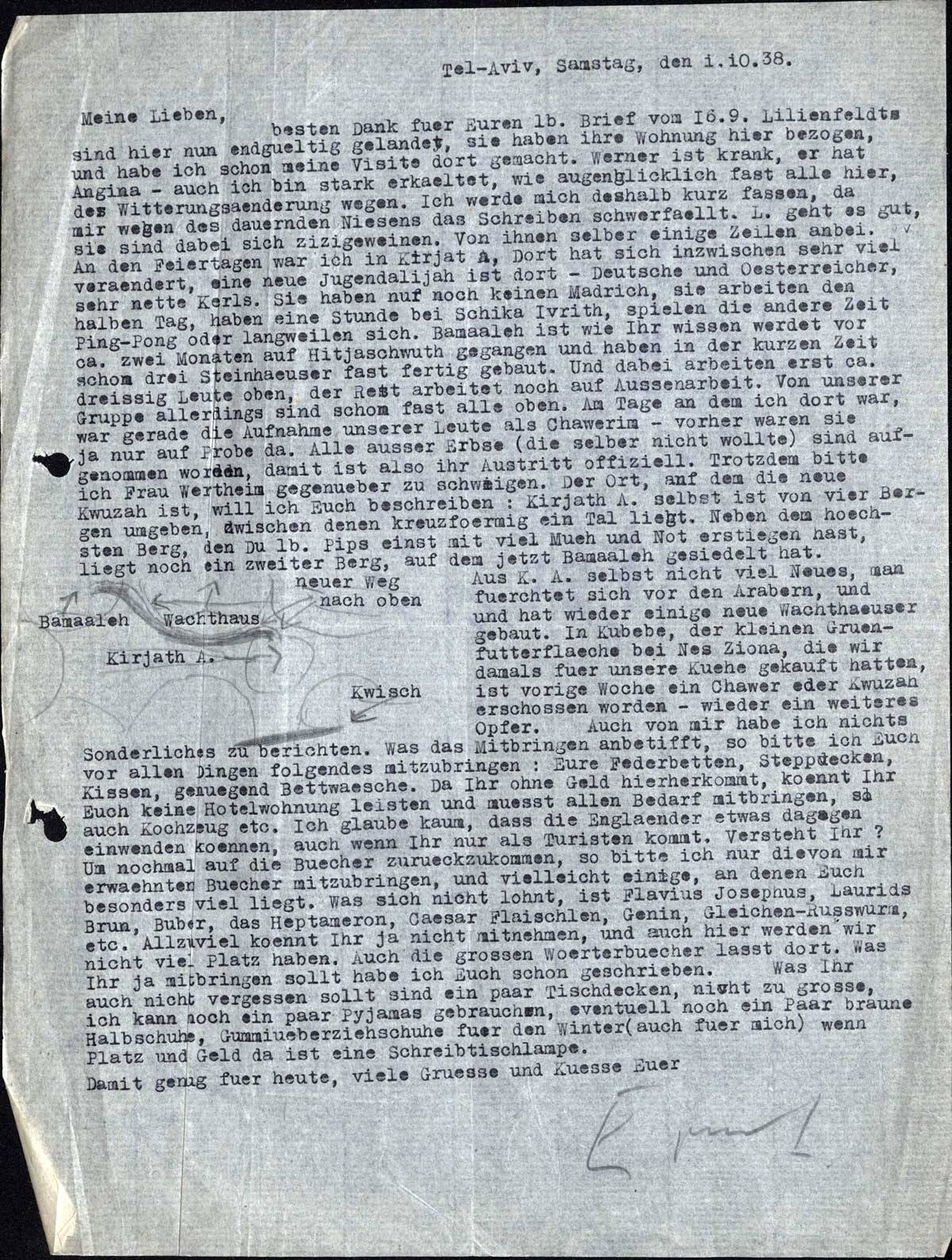 besten Dank fuer Euren lb. Brief vom 16.9. Lilienfeldts sind hier nun endgueltig gelandet, sie haben ihre Wohnung hier bezogen, und habe ich schon meine Visite dort gemacht. Werner ist krank, er hat Angina - auch ich bin stark erkaeltet, wie augenblicklich fast alle hier, der Witterungsaenderung wegen. Ich werde mich deshalb kurz fassen, da mir wegen des dauernden Niesens das Schreiben schwerfaellt. L. geht es gut, sie sind dabei sich zizigeweinen. Von ihnen selber einige Zeilen anbei. An den Feiertagen war ich in Kirjat A. Dort hat sich inzwischen sehr viel veraendert, eine neue Jugendalijah ist dort - Deutsche und Oesterreicher, sehr nette Kerls. Sie haben nur noch keinen Madrich, sie arbeiten den halben Tag, haben eine Stunde bei Schika Ivrith, spielen die andere Zeit Ping-Pong oder langweilen sich. Bamaaleh ist wie Ihr wissen werdet vor ca. zwei Monaten auf Hitjaschwuth gegangen und haben in der kurzen Zeit schon drei Steinhaeuser fast fertig gebaut. Und dabei arbeiten erst ca. dreissig Leute oben, der Rest arbeitet noch auf Aussenarbeit. Von unserer Gruppe allerdings sind schon fast alle oben. Am Tage an dem ich dort war, war gerade die Aufnahme unserer Leute als Chawerim - vorher waren sie ja nur auf Probe da. Alle ausser Erbse (die selber nicht wollte) sind aufgenommen worden, damit ist also ihr Austritt offiziell. Trotzdem bitte ich Frau Wertheim gegenueber zu schweigen. Der Ort, auf dem die neue Kwuzah ist, will ich Euch beschreiben: Kirjath A. selbst ist von vier Bergen umgeben, zwischen denen kreuzfoermig ein Tal liegt. Neben dem hoechsten Berg, den Du lb. Pips einst mit viel Mueh und Not erstiegen hast, liegt noch ein zweiter Berg, auf dem jetzt Bamaaleh gesiedelt hat.